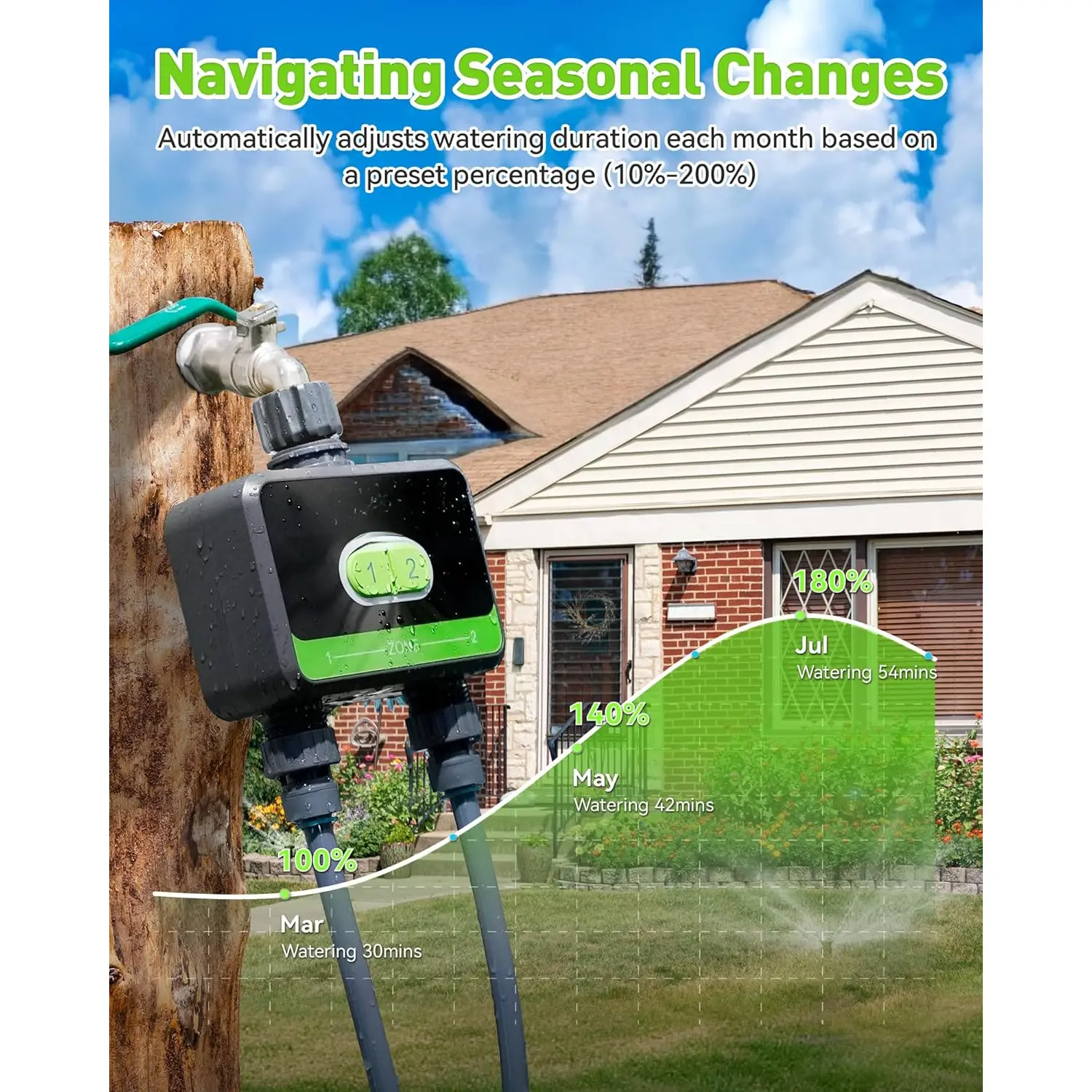 【Make Irrigation Easier】The seasonal adjustment feature automatically adjusts the watering duration by the percentage you set (10%-200%) each month, eliminating the need for you to repeatedly adjust your schedule. water timer is compatible with Alexa and Assistant for hands-free operation via voice commands.