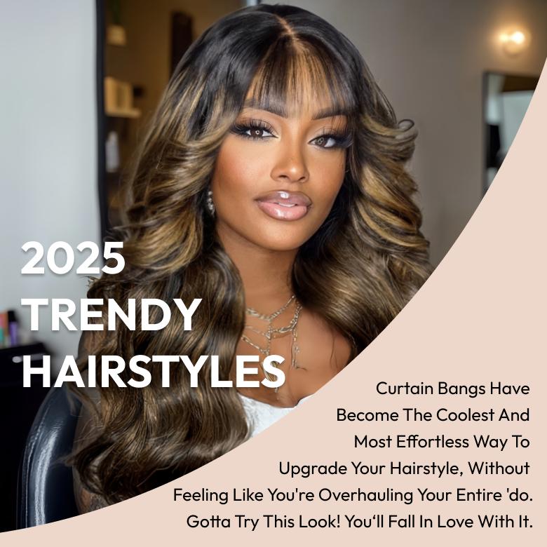 5. 【NEW IN】UNice Pre-Everything Balayage Highlight Fluffy Loose Wave Curtain Bangs Wig Glueless 13x4 Lace Frontal Human Hair Wigs with Upgraded Drawstring