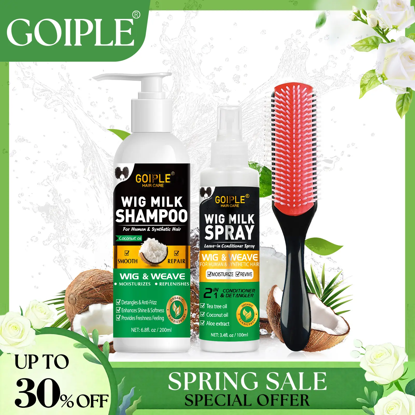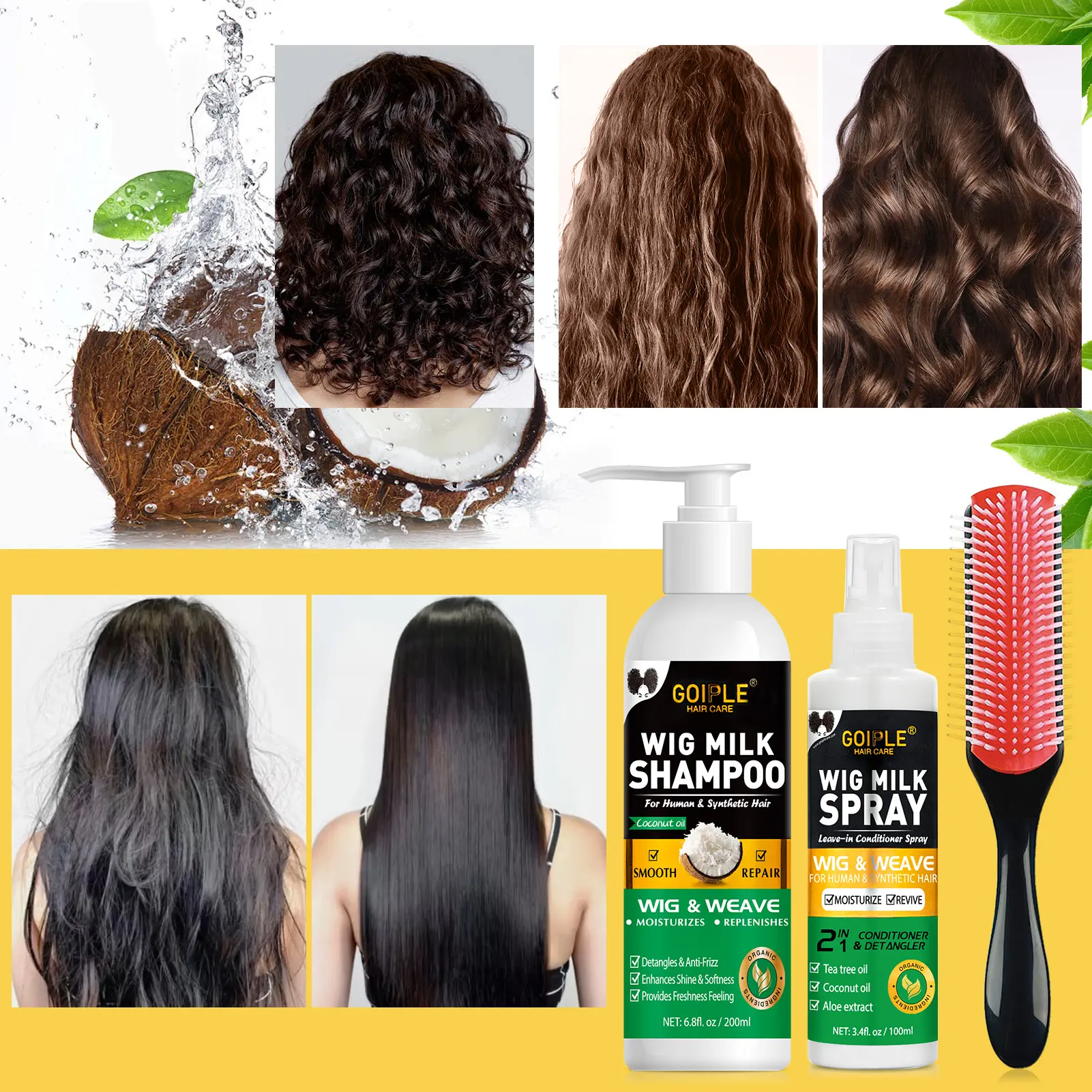 ·2-in-1 Wig Milk Spray: Our innovative wig milk spray combines conditioning and detangling for synthetic hair. Infused with tea tree oil, coconut oil, and aloe essence, it revitalizes and extends the lifespan of your wigs