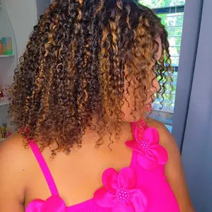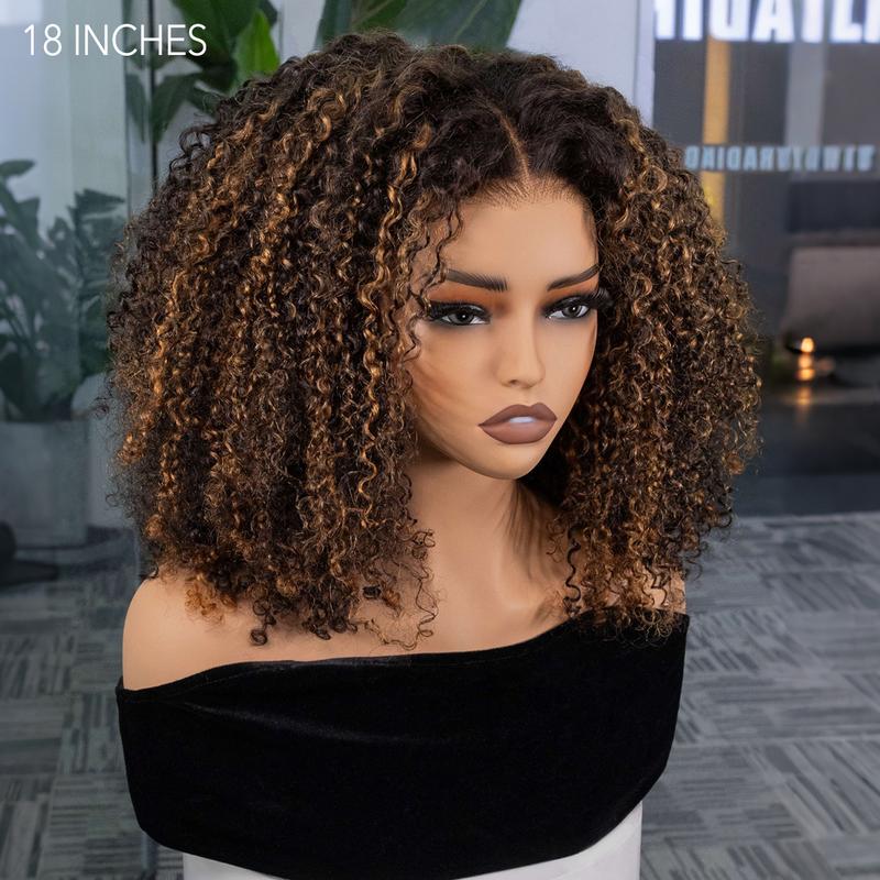 Elevate your hairstyle with the Wavymy Styled-to-Go Casual Blonde Highlights Afro Kinky Curly 7x5 Lace Wear Go Glueless Wigs. This pre-cut and pre-plucked wig is designed to provide a natural look with a 180% density hair volume, ensuring a fuller and more voluminous appearance.