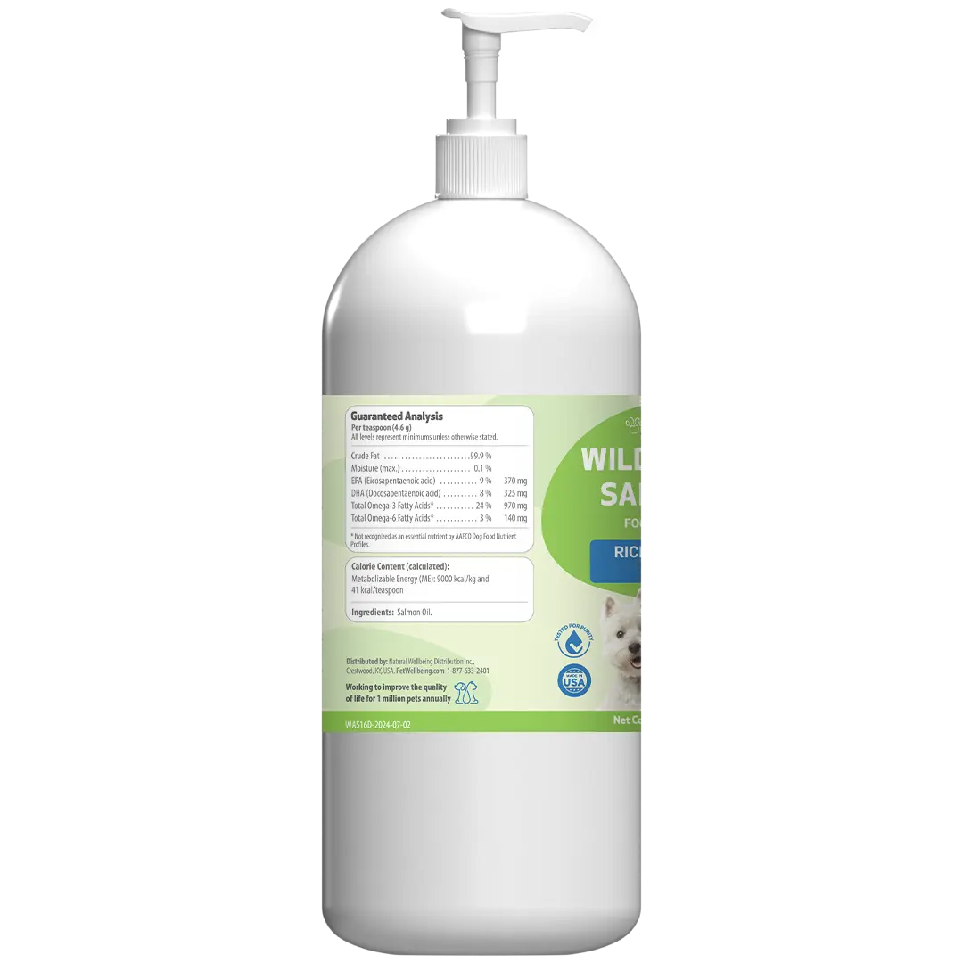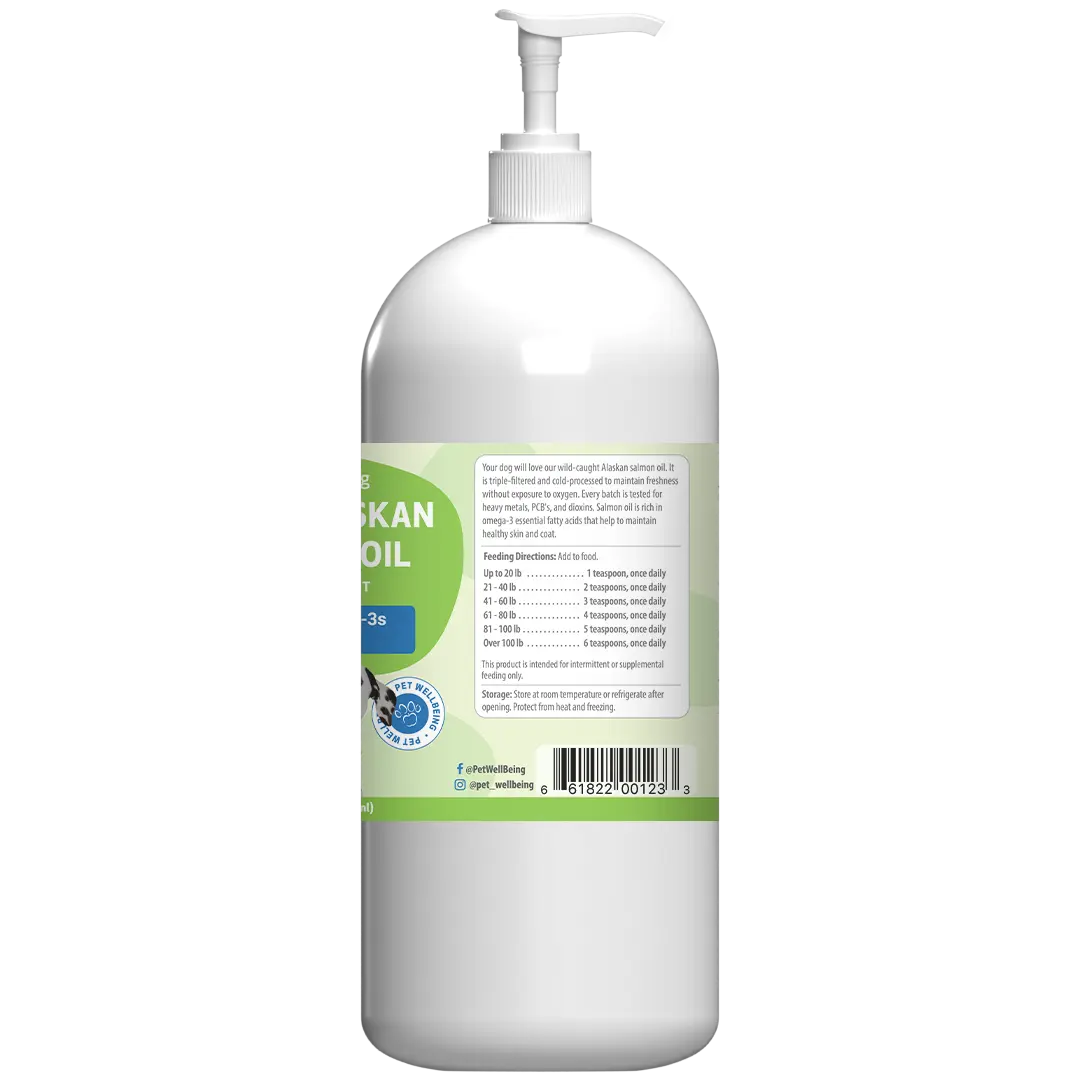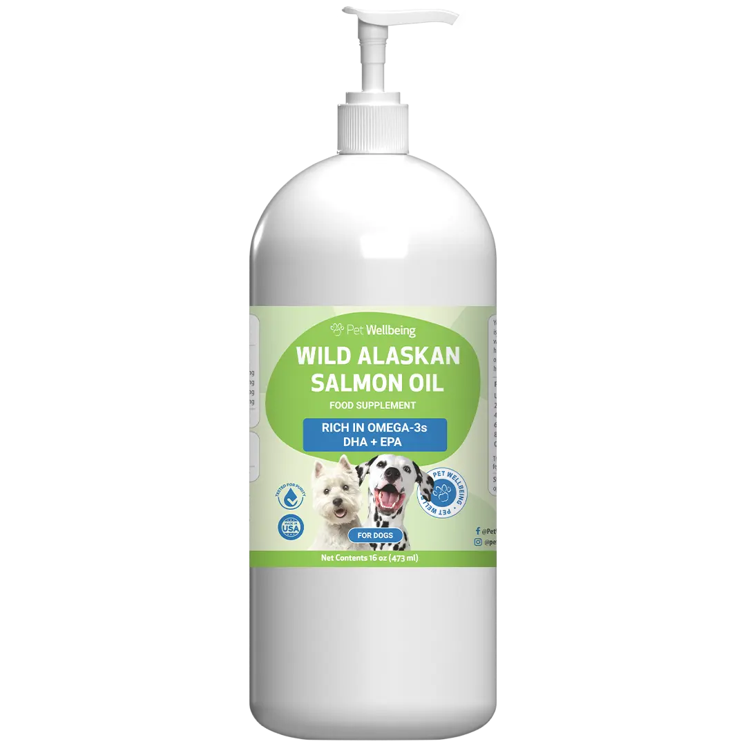 Pet Wellbeing’s Wild Alaskan Salmon Oil is a premium source of omega-3 essential fatty acids (EFAs), including DHA and EPA, derived from wild-caught pink and sockeye salmon. Sourced from the cold waters of Alaska, our salmon oil is triple-filtered and cold-processed to maintain its full strength. Omega-3s are crucial for your dog's overall well-being, especially as they age. Rich in EFAs, our salmon oil supports your dog's joint mobility and strength, and helps promote healthy skin and coat. Every batch undergoes rigorous third-party testing for dioxins, heavy metals, and other contaminants, ensuring your dog receives the purest and highest-quality supplement.