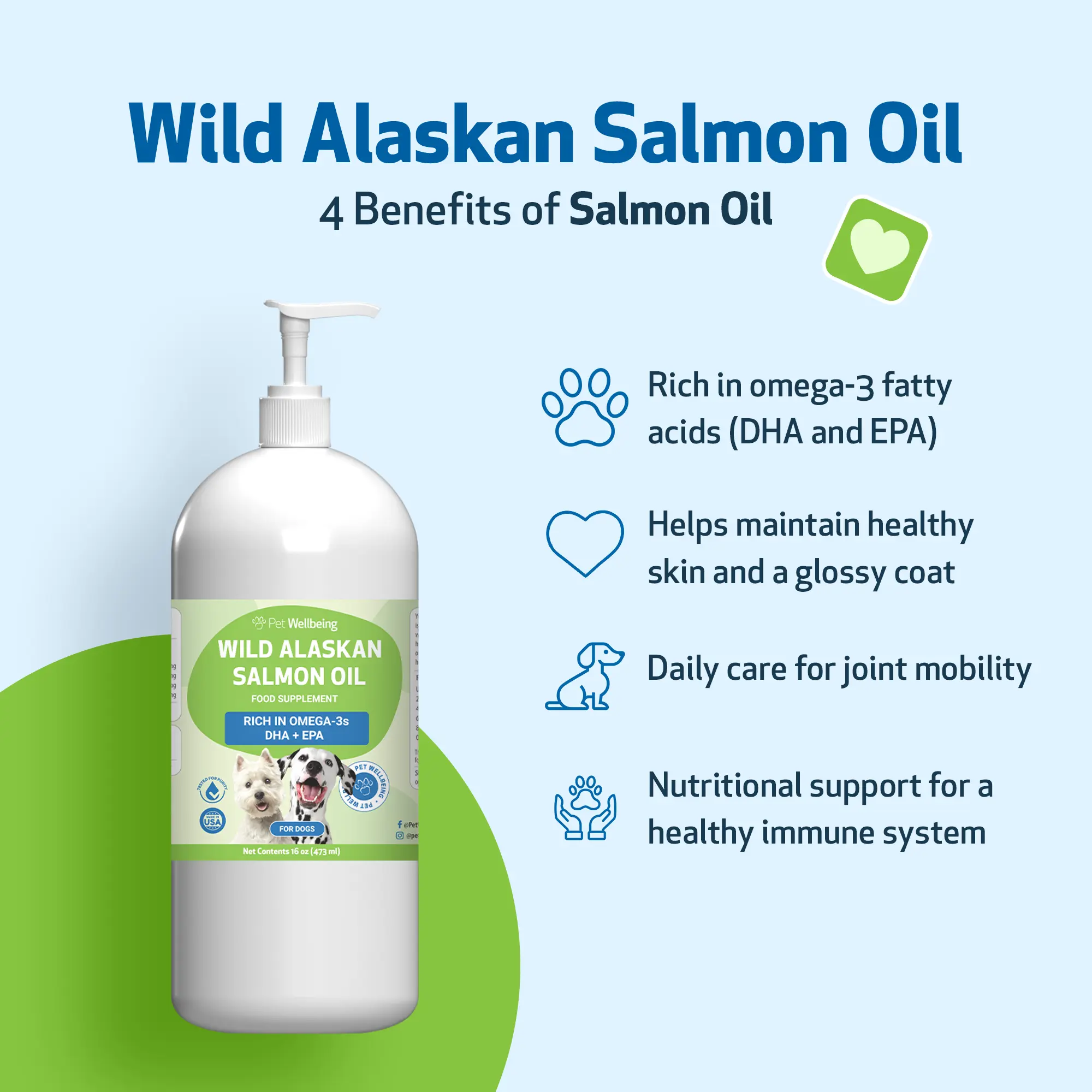 Incorporate Wild Alaskan Salmon Oil into your dog's daily diet to support their joint, immune, and skin health for a vibrant, happy life.
