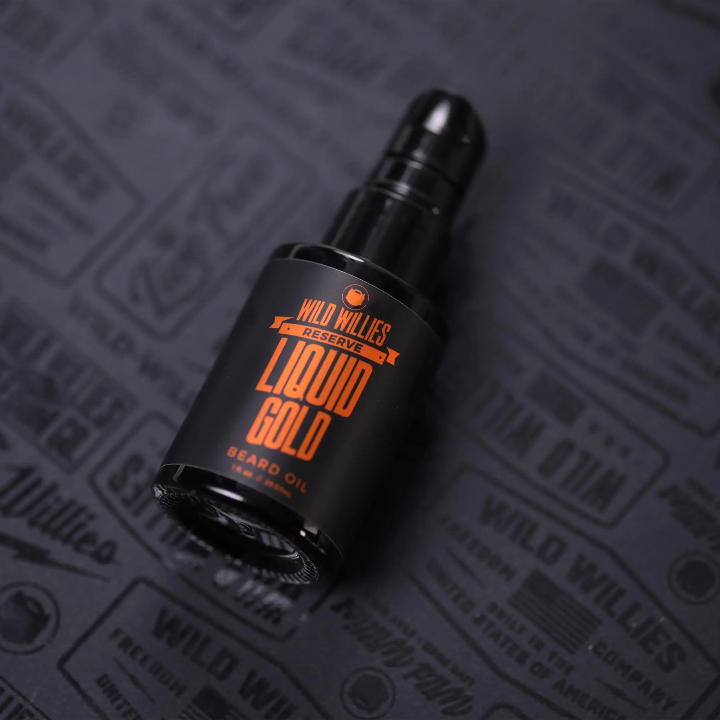LIQUID GOLD BEARD OIL Argan. Jojoba. Sunflower Seed Oil. Non-greasy, fast-absorbing, woodsy scent. Softens coarse hair, kills flyaways, makes hand-styling effortless. One or two drops. That's it.