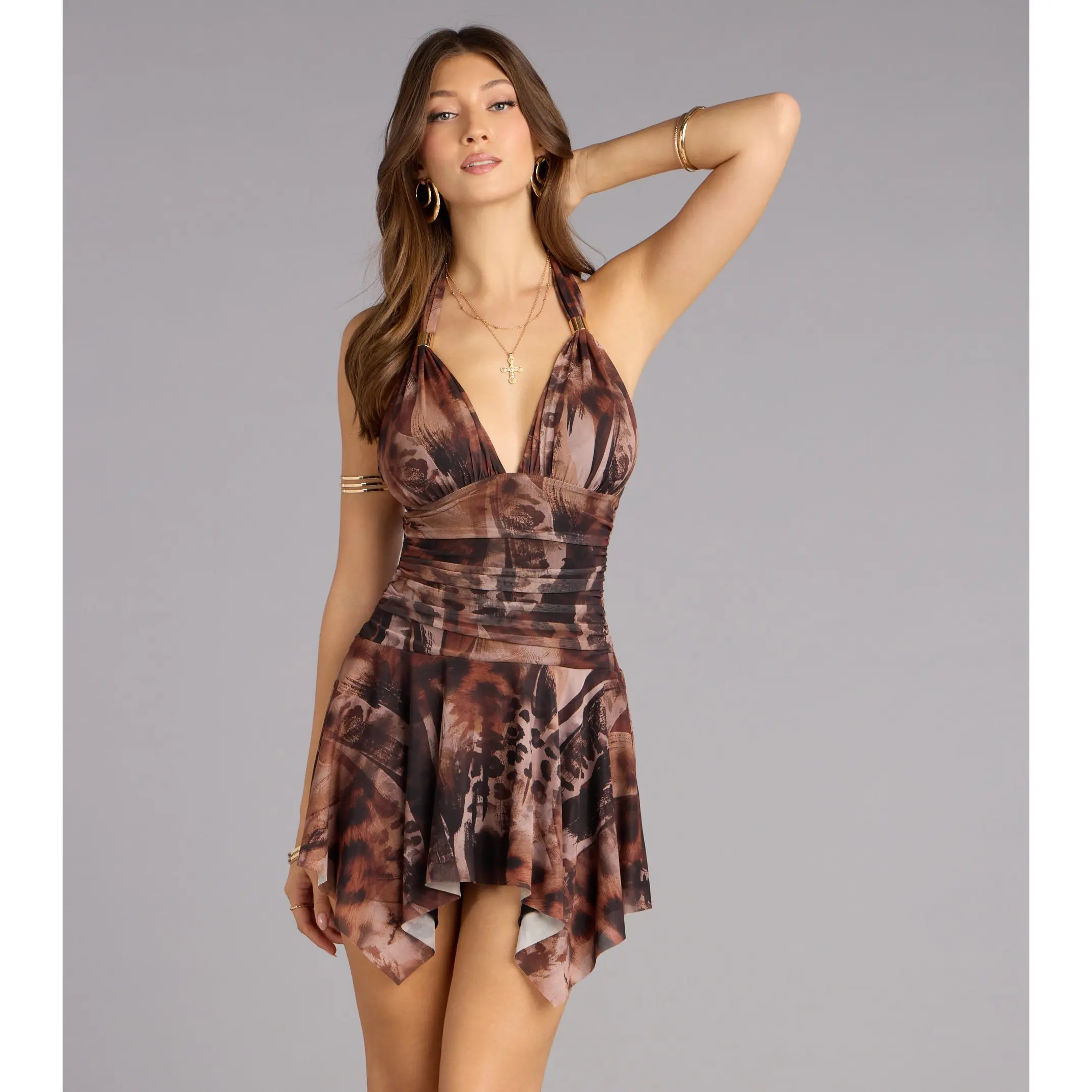For when you want to look effortlessly wild. This halter mini dress blends sultry animal-inspired mesh with a flowy handkerchief hem—made for twirling, flirting, and maybe a little trouble.