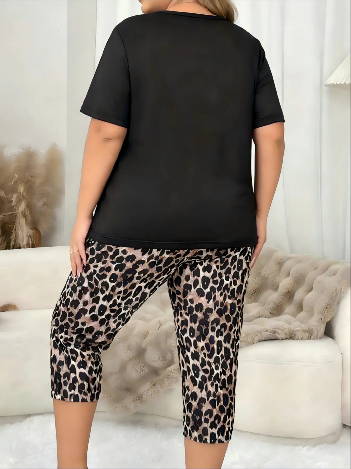 Wild Leopard Heart Patchwork Plus Size Short Sleeve Seven-Quarter Pants Sleepwear Set, Colorblock Loose Fit Home Two-Piece