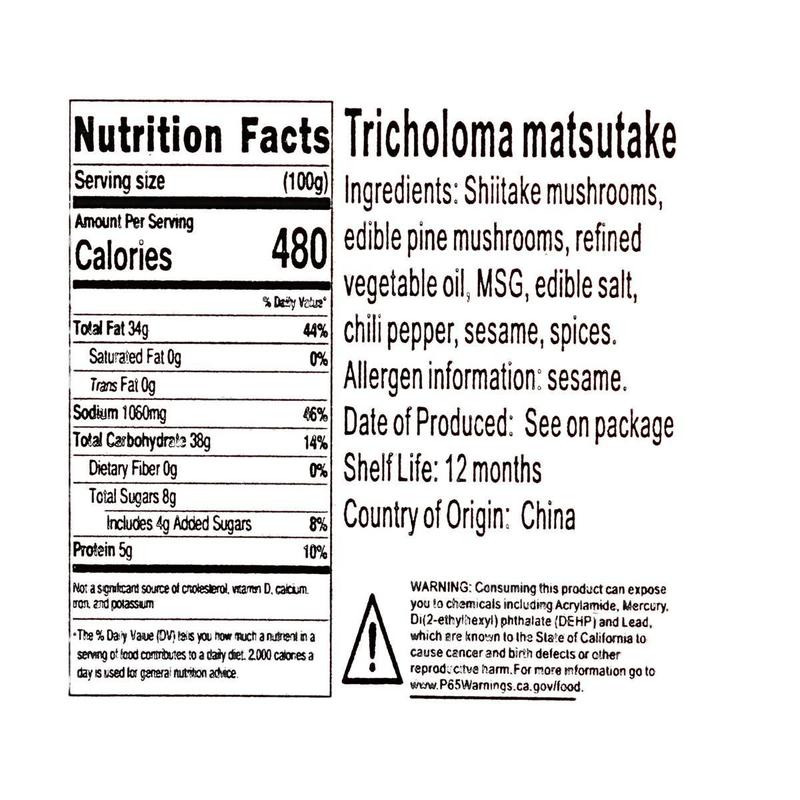 ·Carefully selected fresh matsutake mushrooms with delicious mushroom meat, enhanced with dried chili and fried in high-quality vegetable oil.