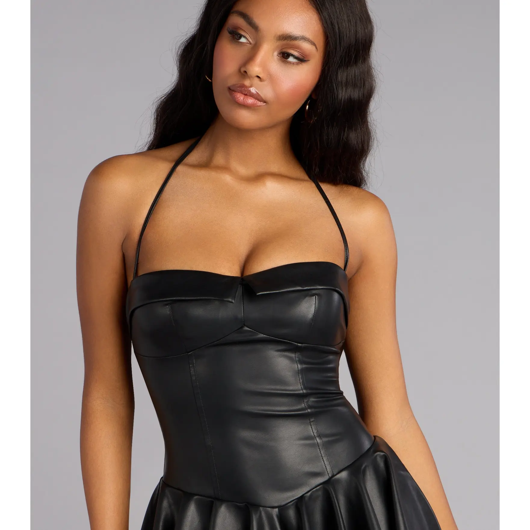 Bring the drama—this faux leather romper doesn’t play it safe. Designed with a flirty halter neckline, structured bodice seams, and a flowy skater-style bottom, it’s perfect for concerts or nights when you want to stand out.