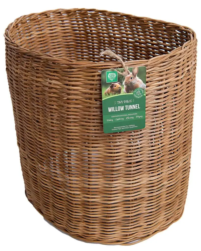 My rabbits love hiding in and running through tunnels. My plastic tunnel looked great, but the bunnies kept biting off pieces of it, which worried me, because they shouldn't be eating plastic. Then I got this willow tunnel. I was surprised at its size--it is large enough to contain both of my medium-sized rabbits at the same time. Sadly, the bunnies are already chewing on it, but at least now I don't have to worry about them ingesting plastic. I will order this product again. They like it, and the quality/safety are excellent.