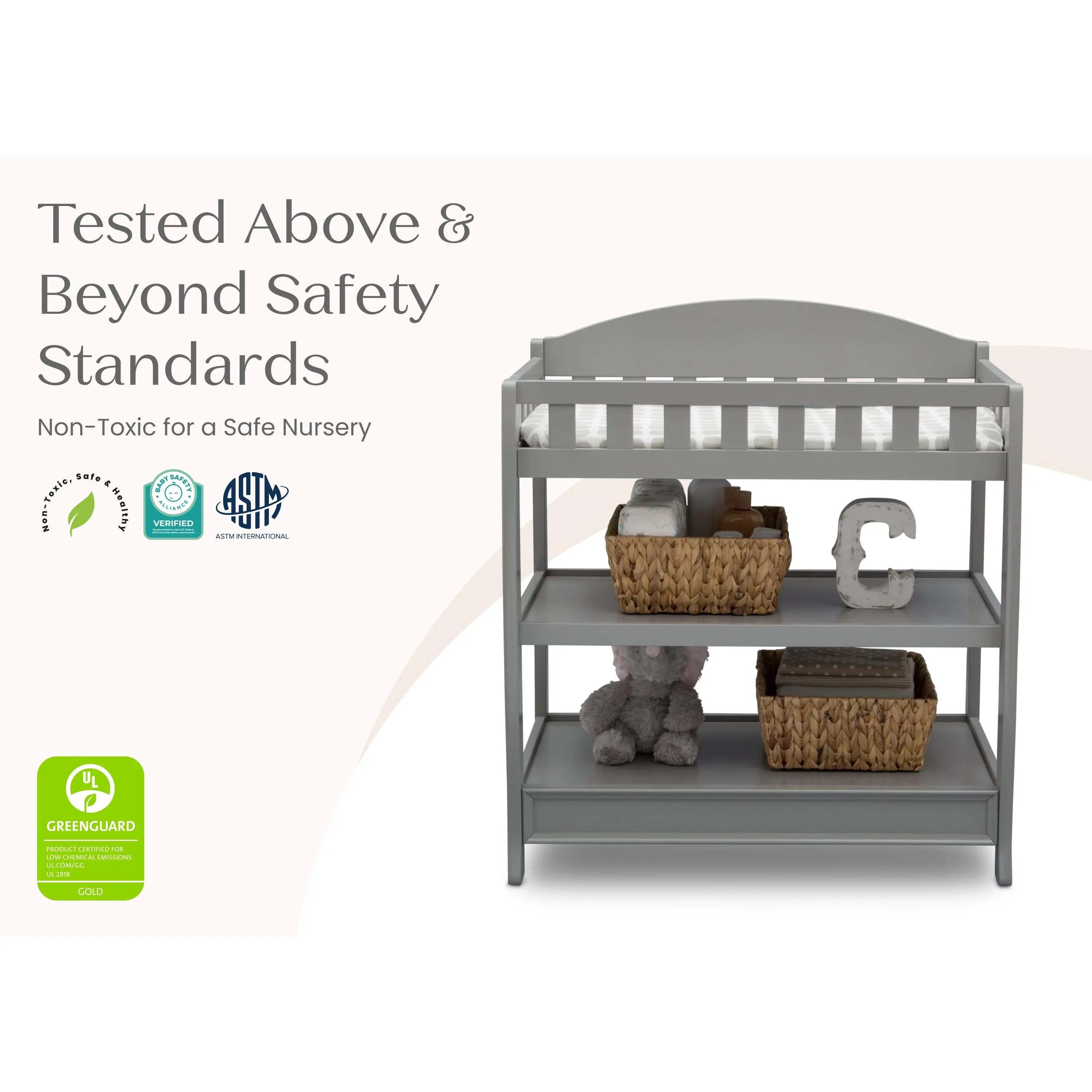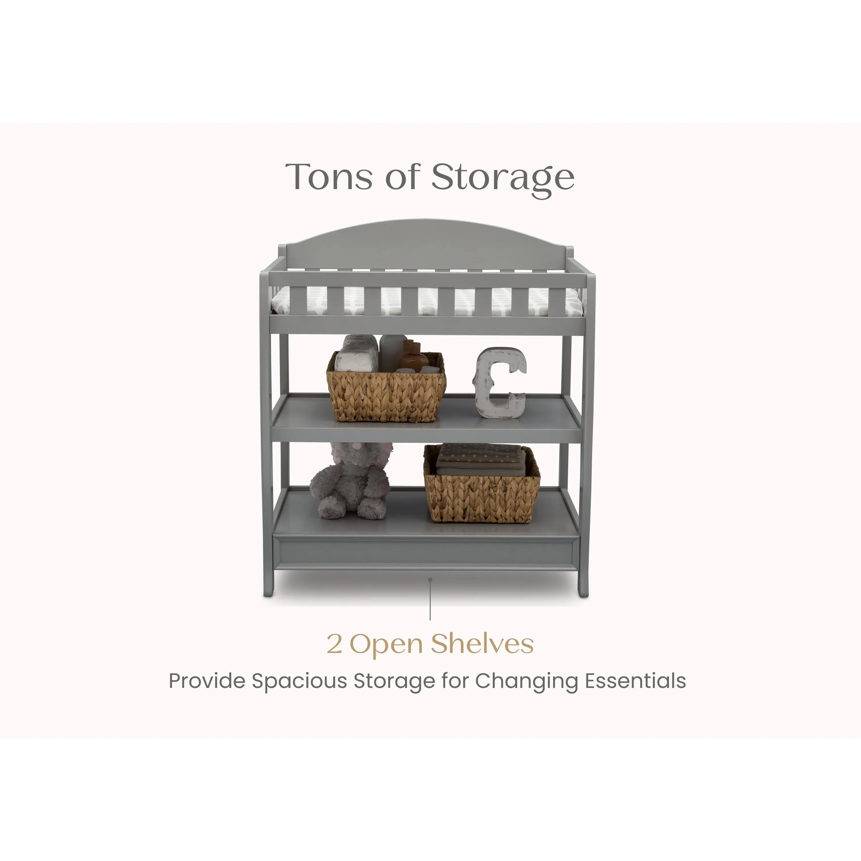 Change or dress your baby in absolute comfort with the Wilmington Changing Table with Pad from Delta Children. Designed with a timeless bell-shape silhouette and versatile features that make diaper changes easier, this changing table has two shelves that allow you to store your child's changing and dressing necessities nearby. The included changing pad comes with an attached safety strap and is placed in a fully enclosed dressing area that provides extra security. The Wilmington Changing Table is available in several popular finishes and coordinates with many Delta Children cribs.