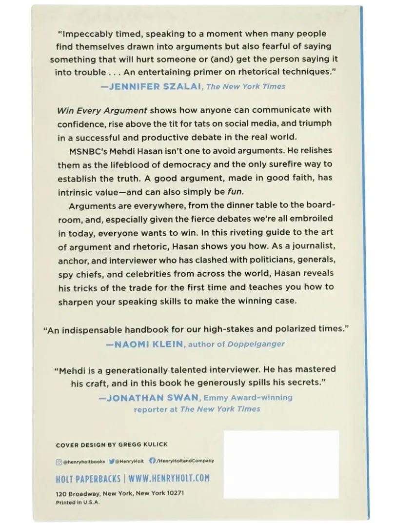 “Win Every Argument is hugely entertaining, deeply knowledgeable, and filled with illuminating tips and stories from Mehdi Hasan’s life of debating, interviewing and advocating for his beliefs. Read this book to find your own voice while learning both the art and history of persuasion.”