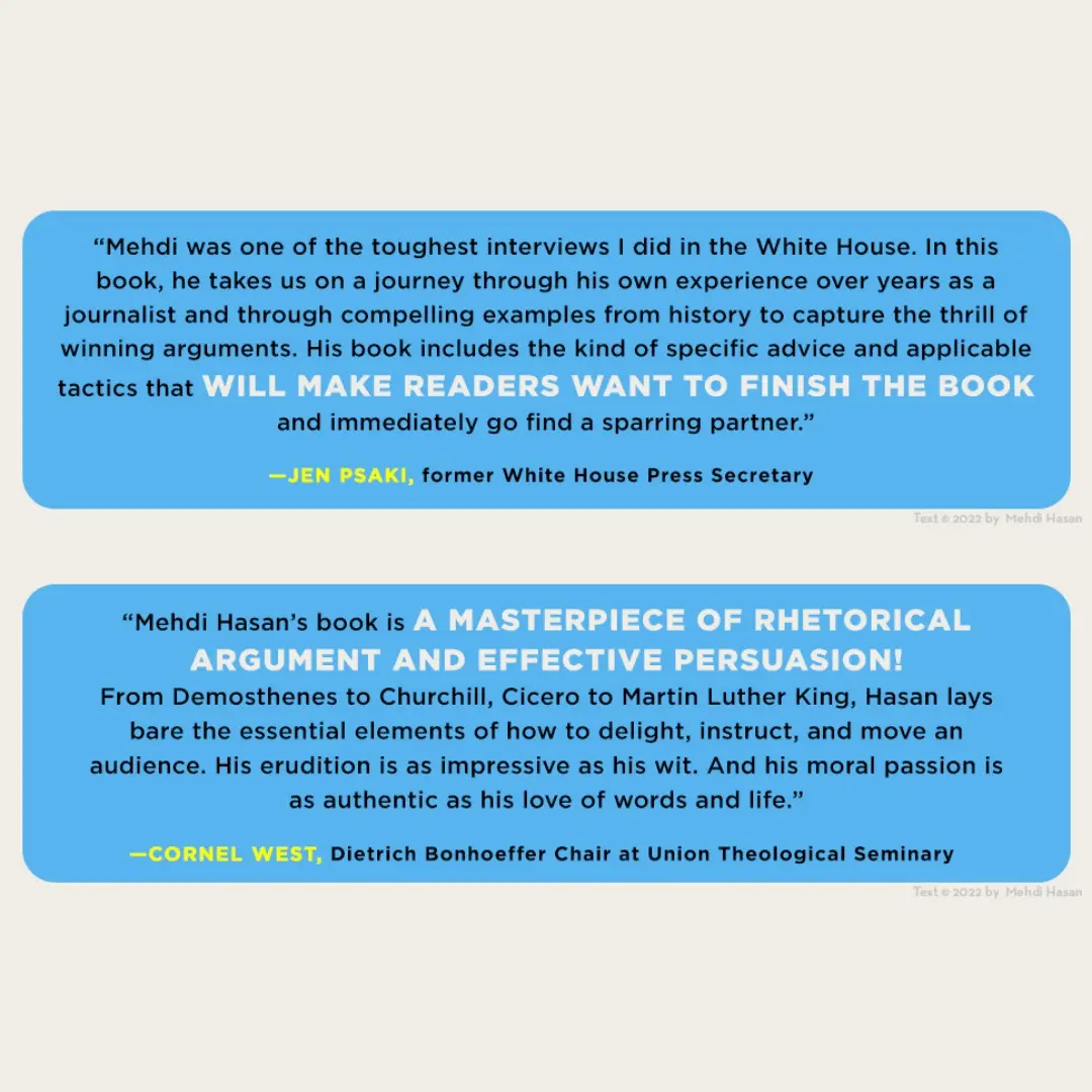 “Mehdi was one of the toughest interviews I did in the White House. In this book, he takes us on a journey through his own experience over years as a journalist and through compelling examples from history to capture the thrill of winning arguments. His book includes the kind of specific advice and applicable tactics that will make readers want to finish the book and immediately go find a sparring partner.”
