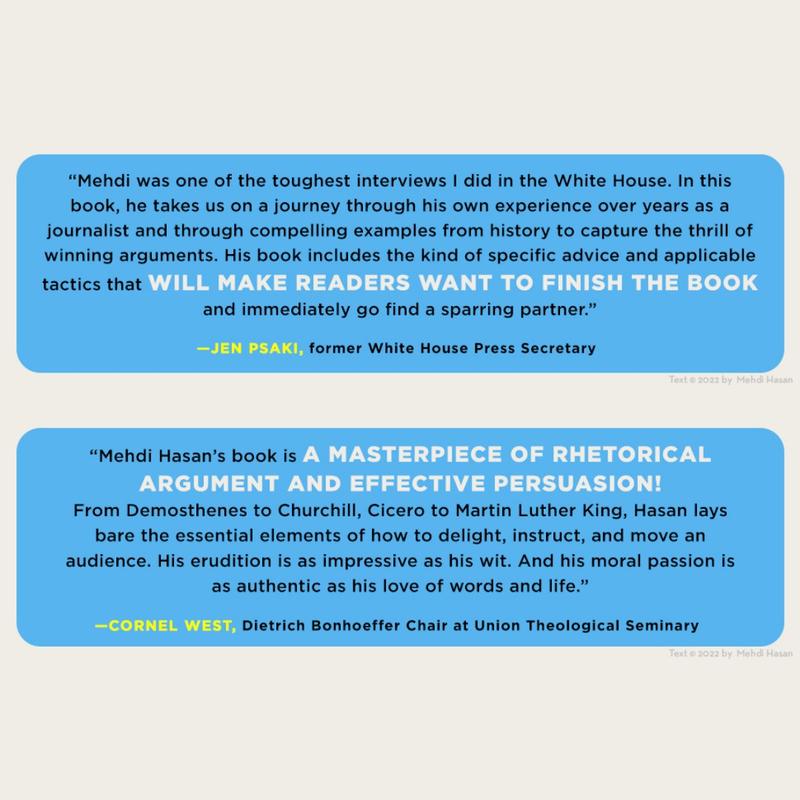 โMehdi Hasanโs book is a masterpiece of rhetorical argument and effective persuasion! From Demosthenes to Churchill, Cicero to Martin Luther King, Hasan lays bare the essential elements of how to delight, instruct, and move an audience. His erudition is as impressive as his wit. And his moral passion is as authentic as his love of words and life.โ