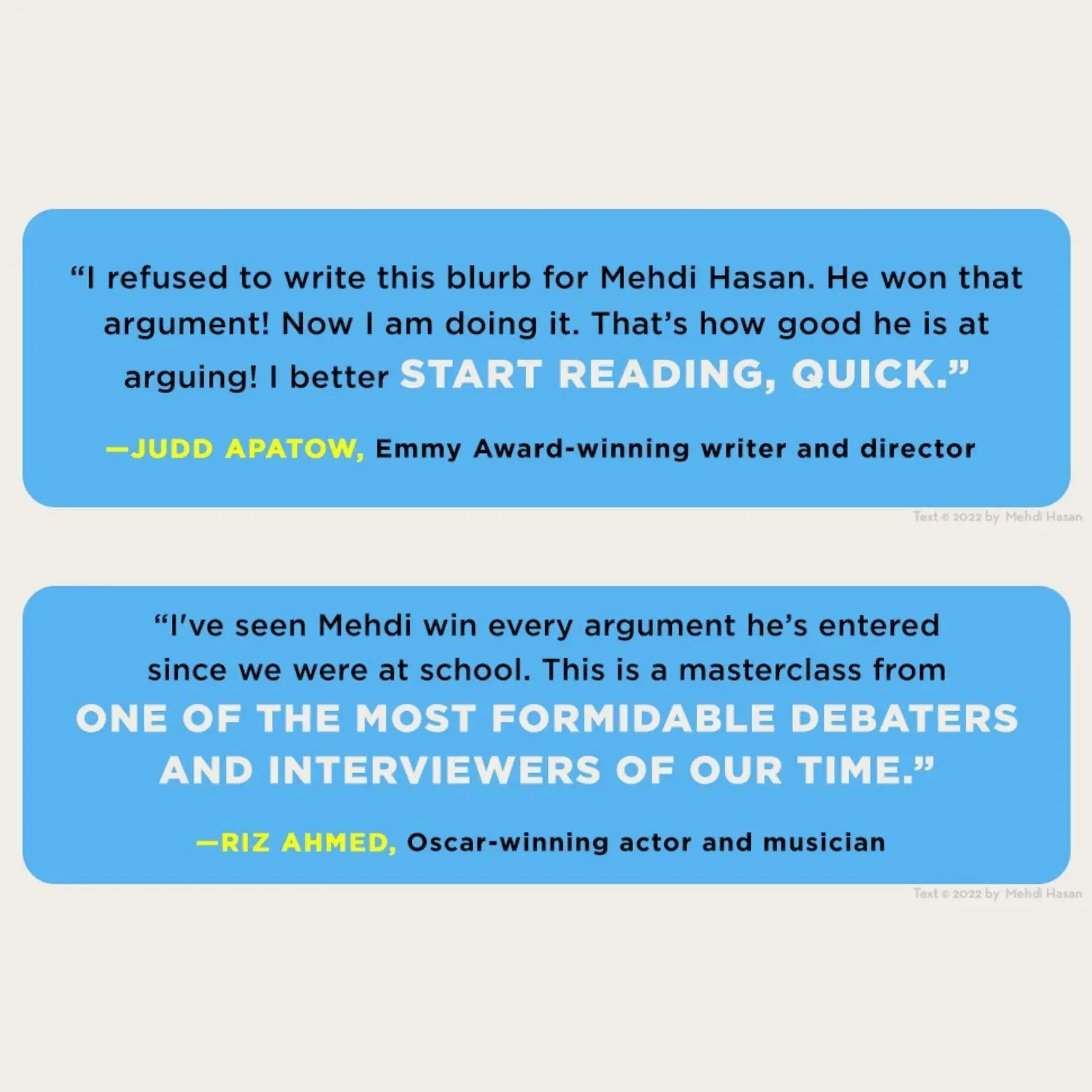 “Mehdi Hasan’s book is a masterpiece of rhetorical argument and effective persuasion! From Demosthenes to Churchill, Cicero to Martin Luther King, Hasan lays bare the essential elements of how to delight, instruct, and move an audience. His erudition is as impressive as his wit. And his moral passion is as authentic as his love of words and life.”