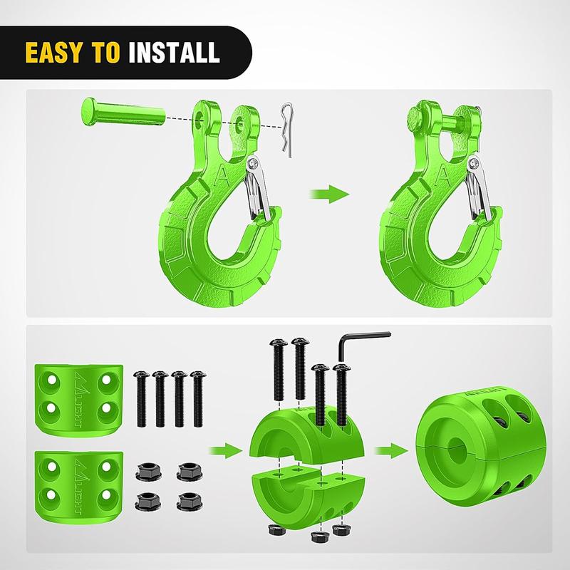 ·【EAST TO INSTALL】-The Winch Hook Has a Spring Loaded Safety Latch to Help Ensure a Secure Connection, Secured with a 1/2" Diameter Clevis Pin. the Winch Cable Hook Stop is a Two-piece Silicone Rubber Design with 4 Strong Carbon Steel Bolts, 4 Lock nuts and 4 Washers, with the Addition of a Portable Allen Wrench Tool and a Split Design for Easy Installation.