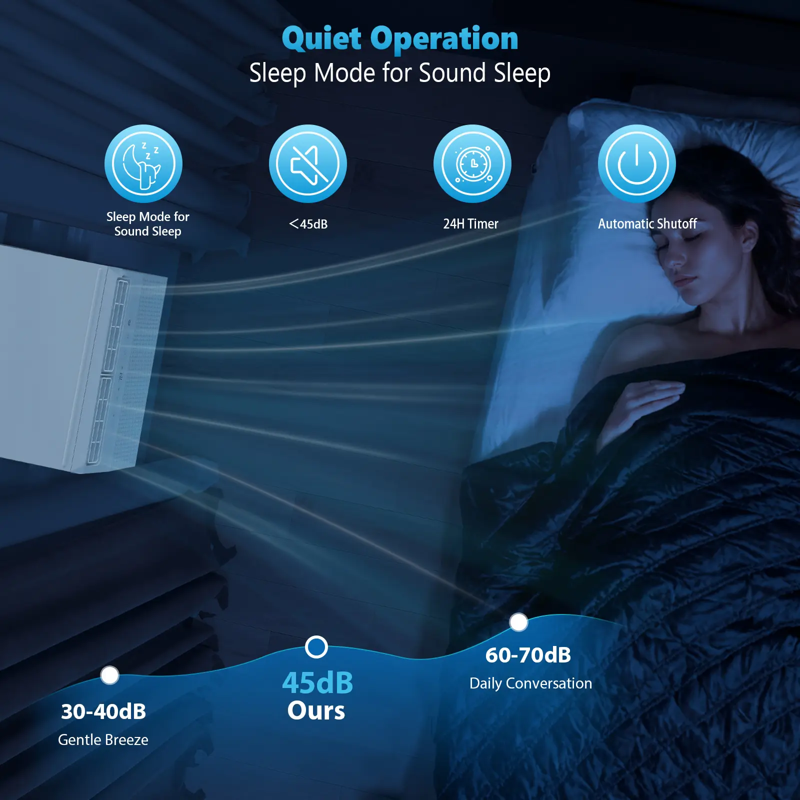 ·Quiet Operation: With the saddle design, the compressor is located outside (and below the level of your window) , the air conditioner operates between 38 and 45 decibels, which is significantly quieter than standard window air conditioners.