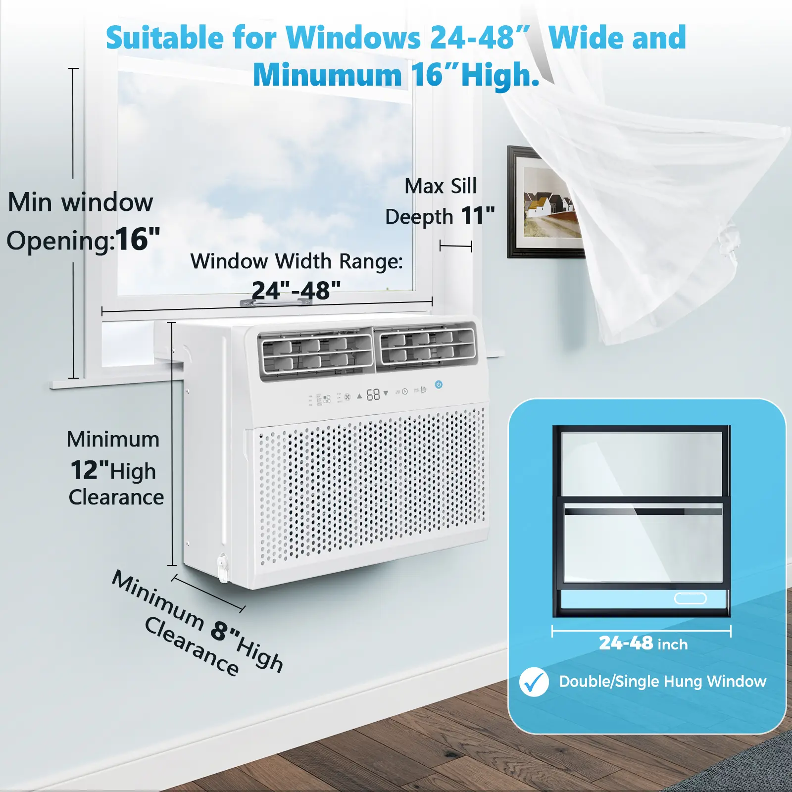 ·Barely Blocks Your View - Unlike traditional U shaped window air conditioner, ours is designed to maintain the full view through the window. You can open and close the window whenever you want a bit of fresh air. Fits windows 24"-48" wide, 16" minimum window opening height, 8" minimum height from floor.