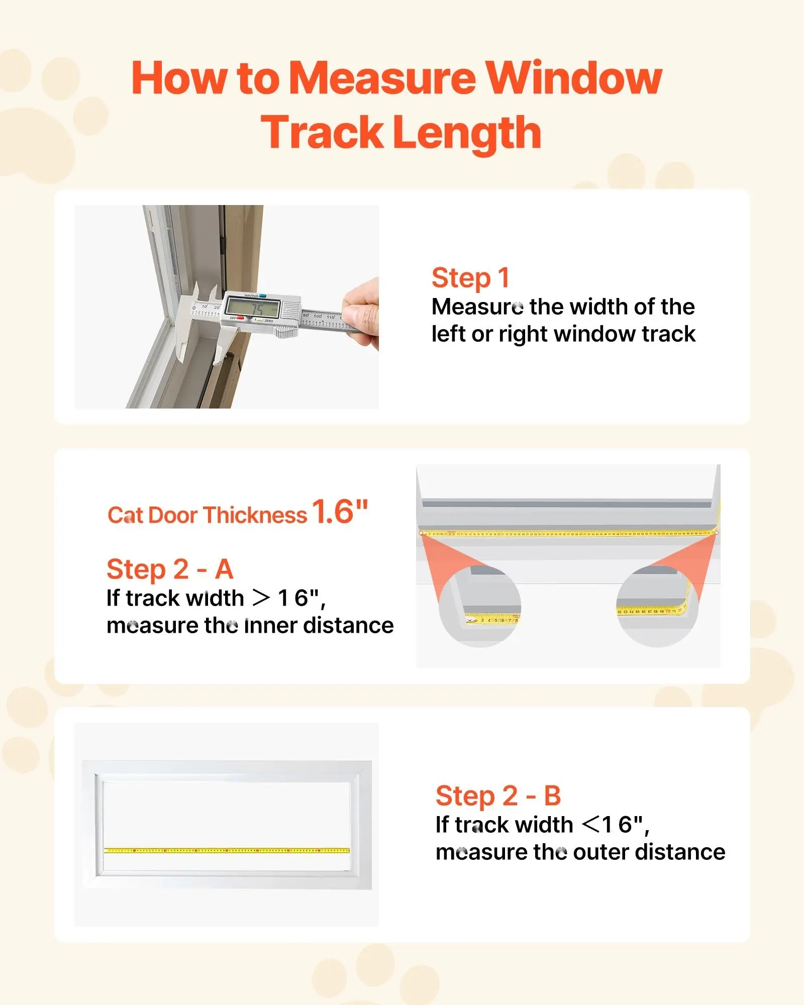 Measure before purchasing. If your window track is wider than the cat door's 1.6-inch thickness, measure the inner track length; if it is narrower, measure the outer track. Double-check your measurements to make sure they fall within the adjustable range.