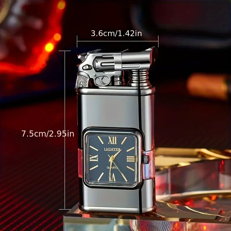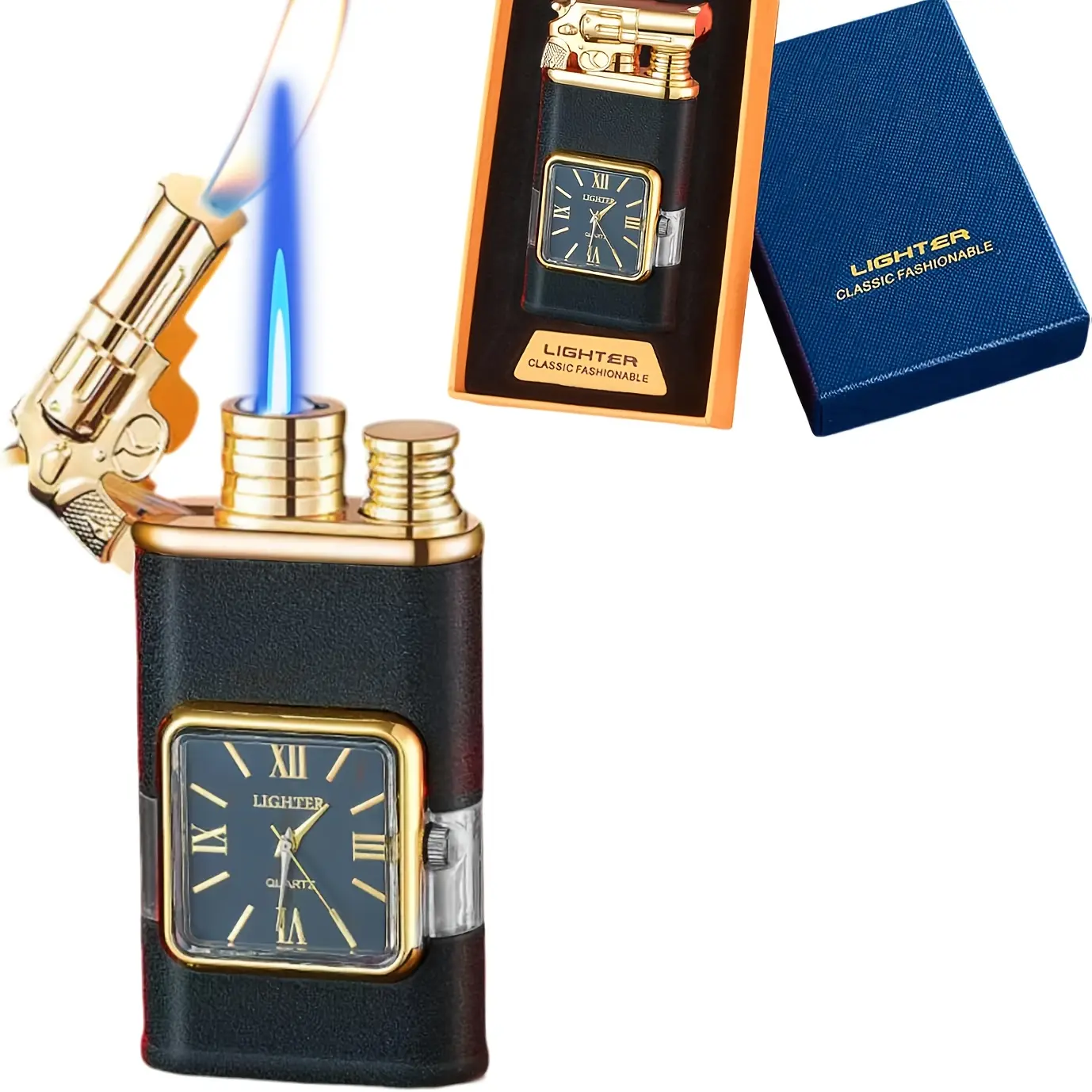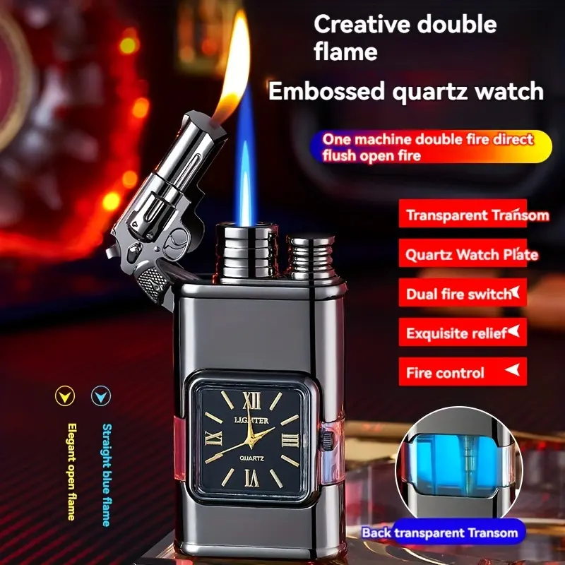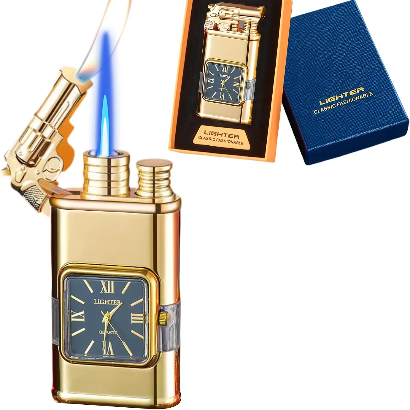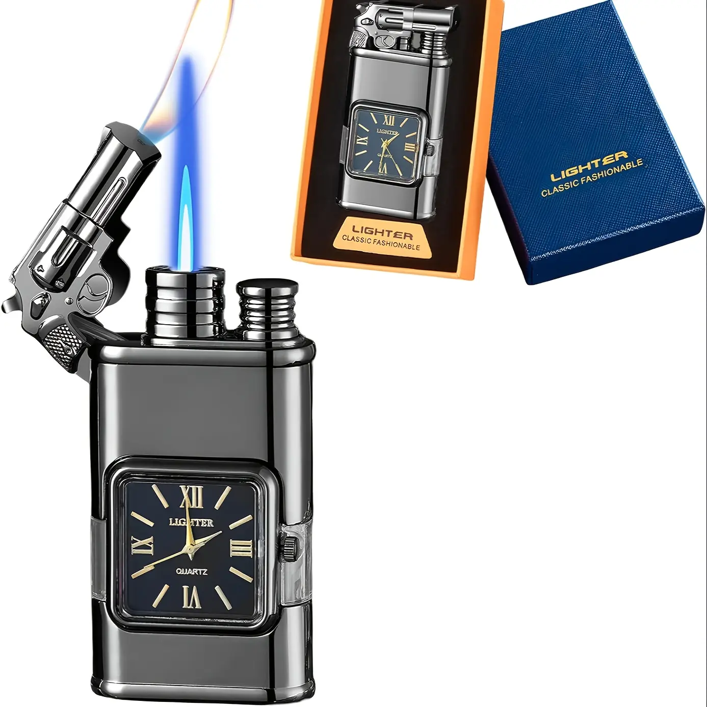 Double Flame Creative Windproof Torch Lighter Portable Lighter That Can Be Repeatedly Refilled With Butane Gas Retro Quartz Dial Torch Lighter Men's Gift Gift Box Packaging (Butane Gas Not Included)