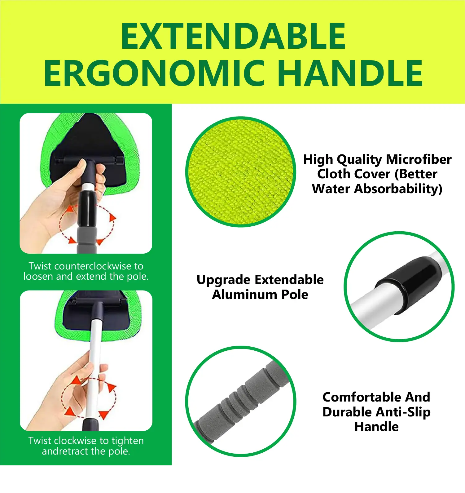 Generically made the pole slides down.When you try to move it on the window, which makes it hard to clean. The microfiber cloths are super thin and leave streaks