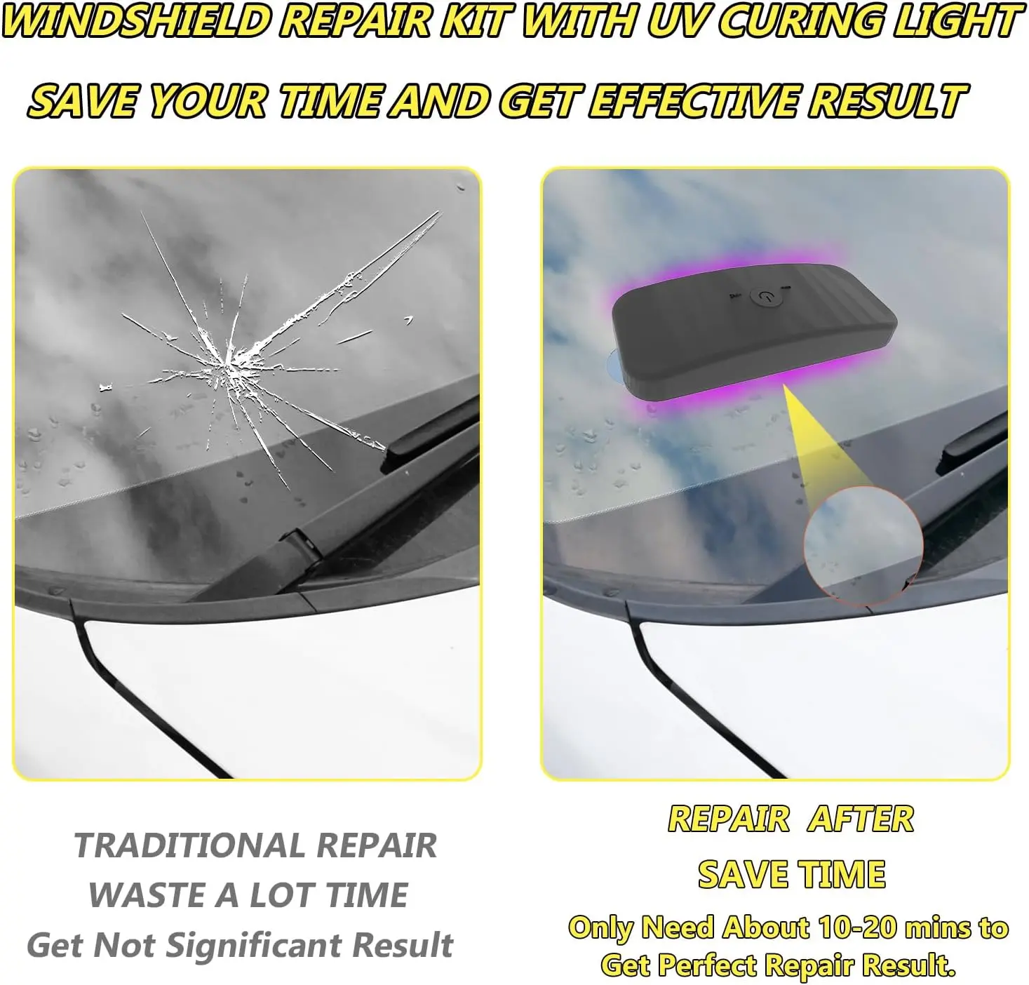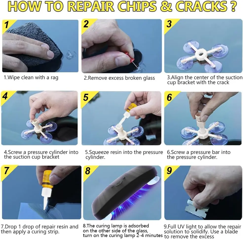 ·Updated Windshield Chip Repair Kit: Our newly upgraded glass repair kit with UV curing light, no mixing required, windshield chip repair kit quickly and efficiently repairs small damage in 5-10 minutes, Save your time and budget, stop the spreading of car glass chips and cracks, restoring windshields to near new condition.