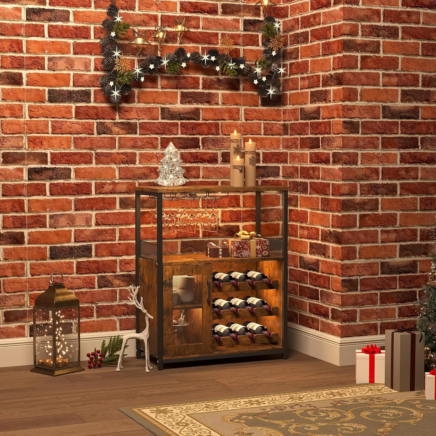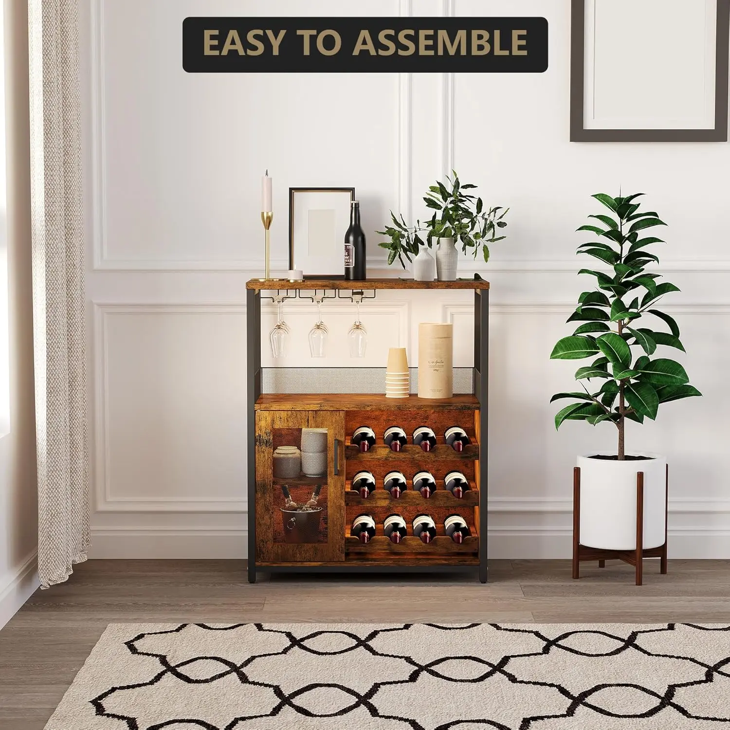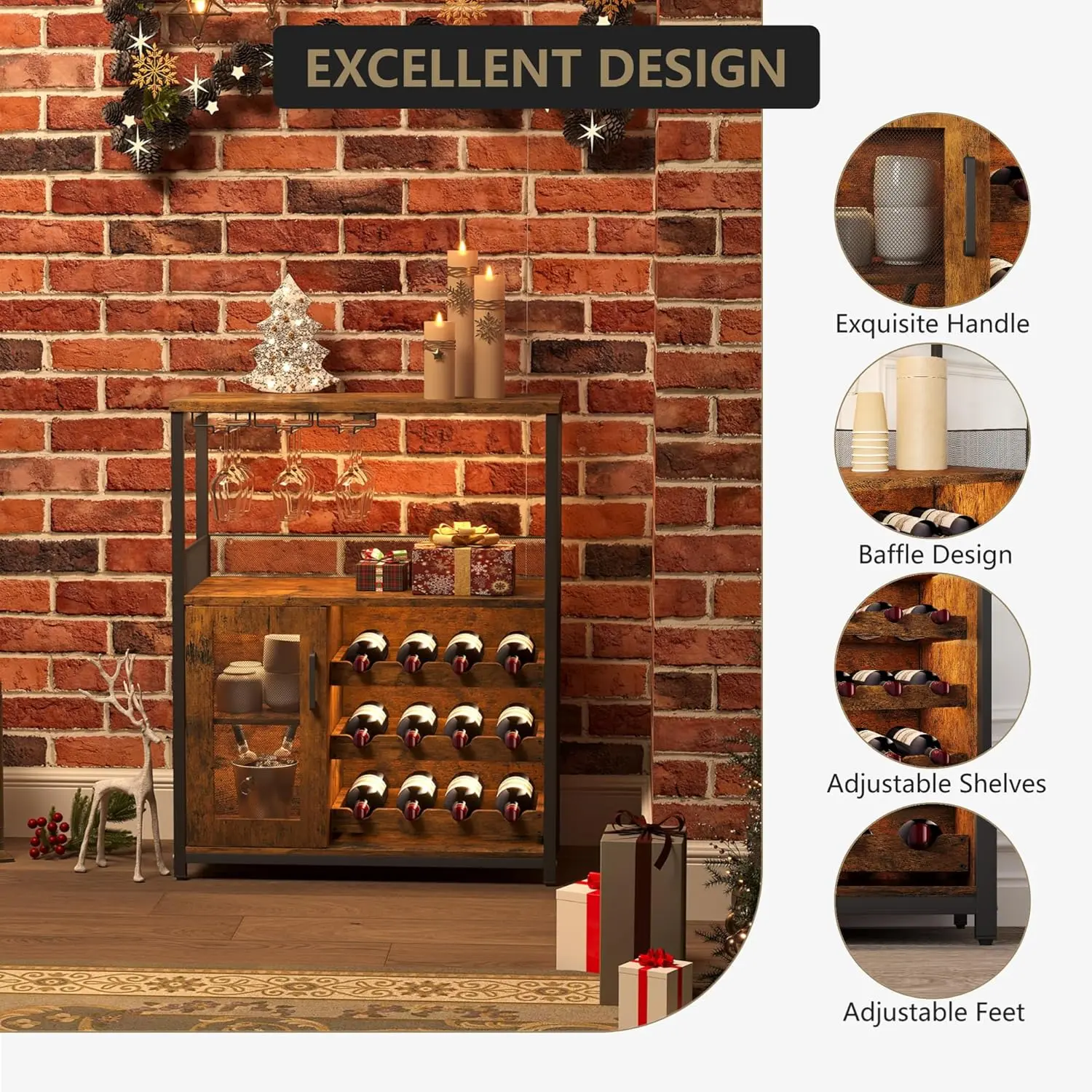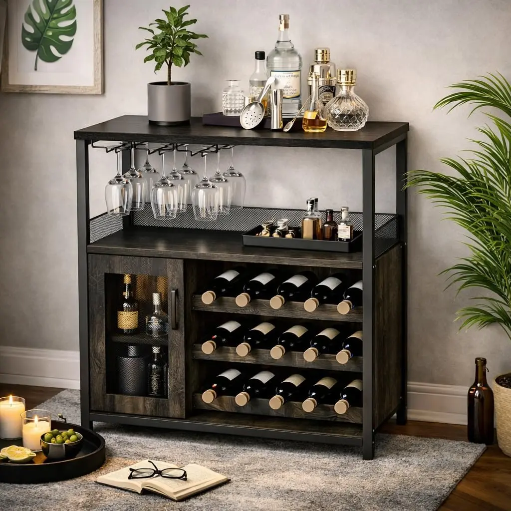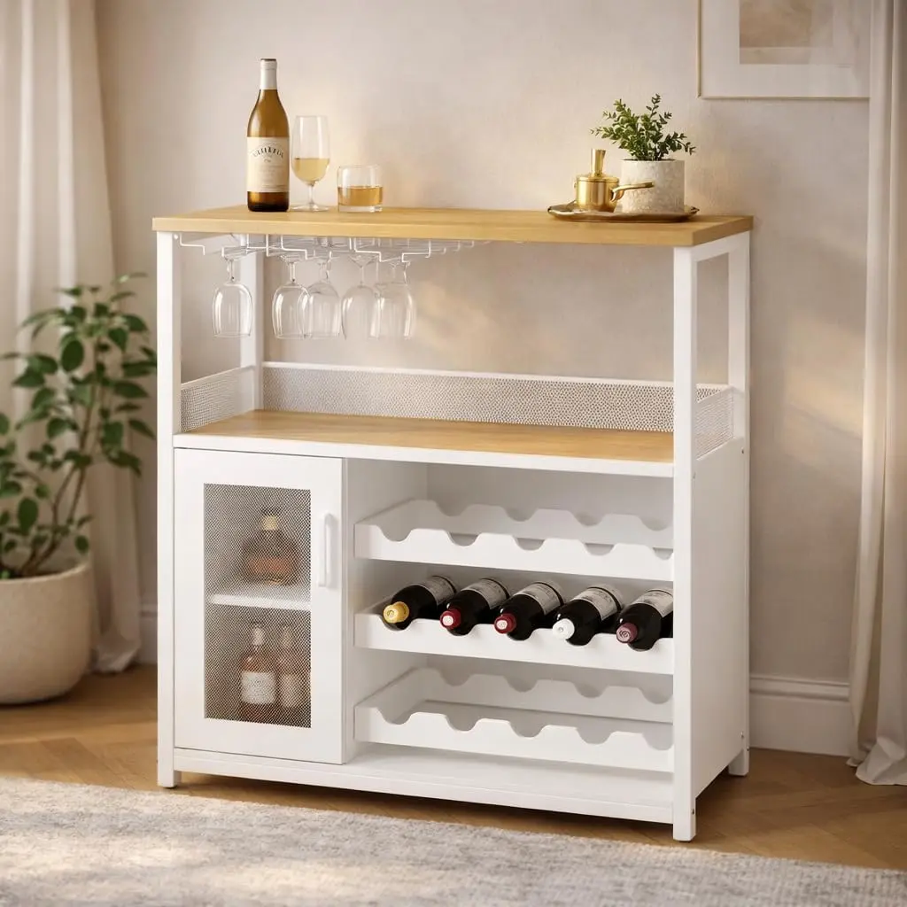 ·Home Bar Storage Cabinet: Includes a removable wine rack (holds up to 12 bottles), a built-in stemware holder, and a lower mesh-door cabinet to store bottles, glassware, coffee supplies, or serveware in one compact cabinet.