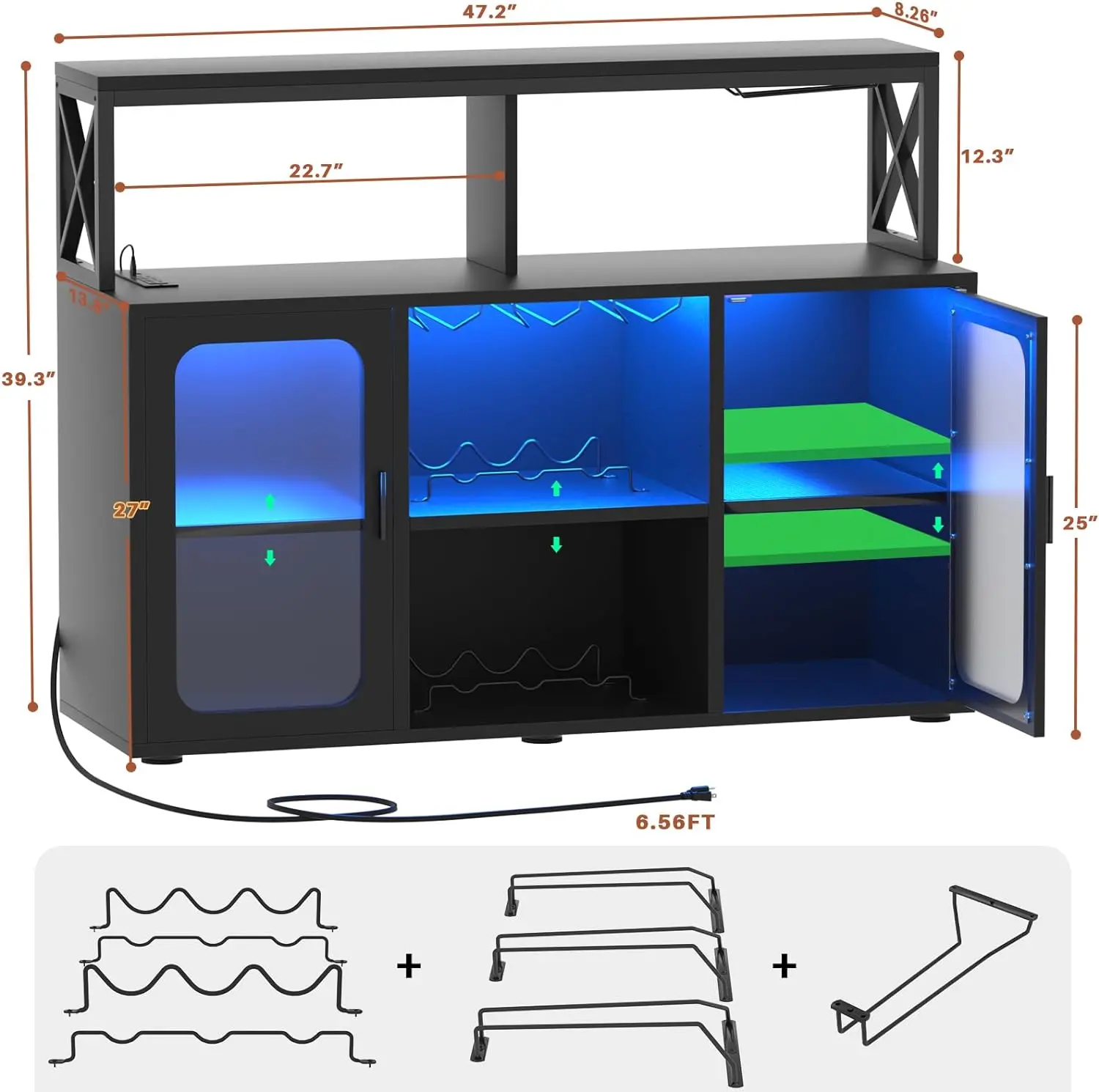 ·The 2-layer cabinet with adjustable shelves with doors accommodates all sizes of whiskeys, liquors, and wine bottles. With 4 glass racks, wine Glasses hang upside down conveniently and stylishly.