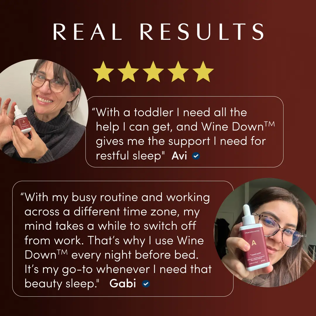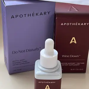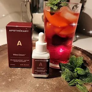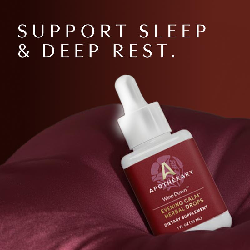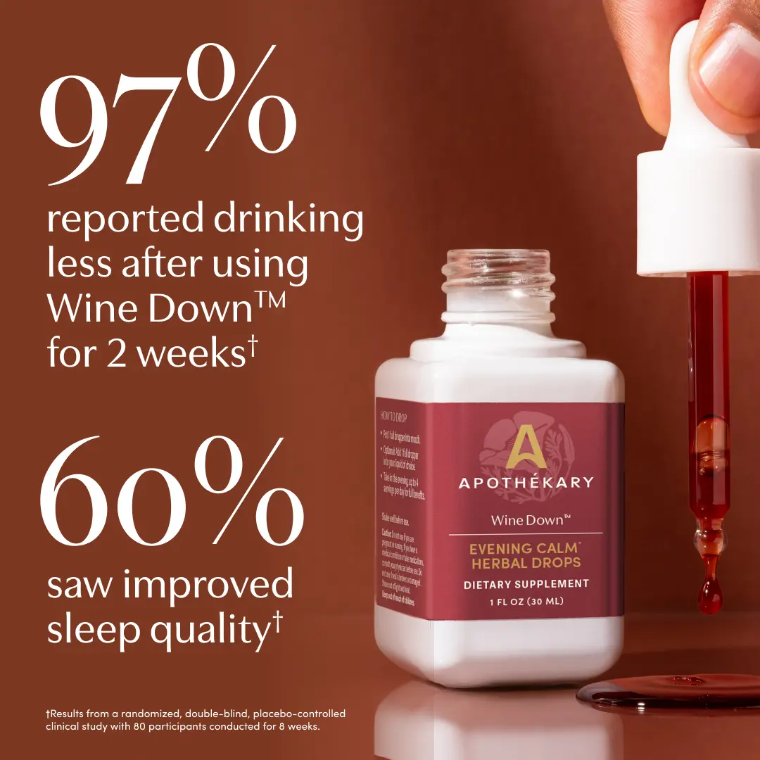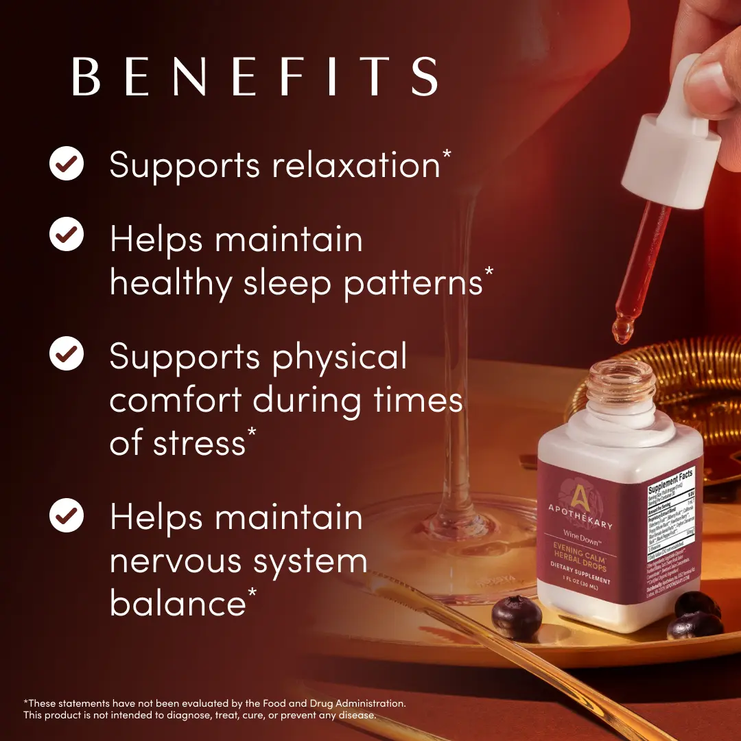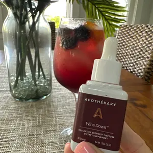 Wine Down by Apothékary is a red wine-inspired alcohol alternative tincture featuring relaxation and sleep-inducing herbal ingredients that help ease body discomfort, calm feelings of stress, and soothe you to deep rest.*