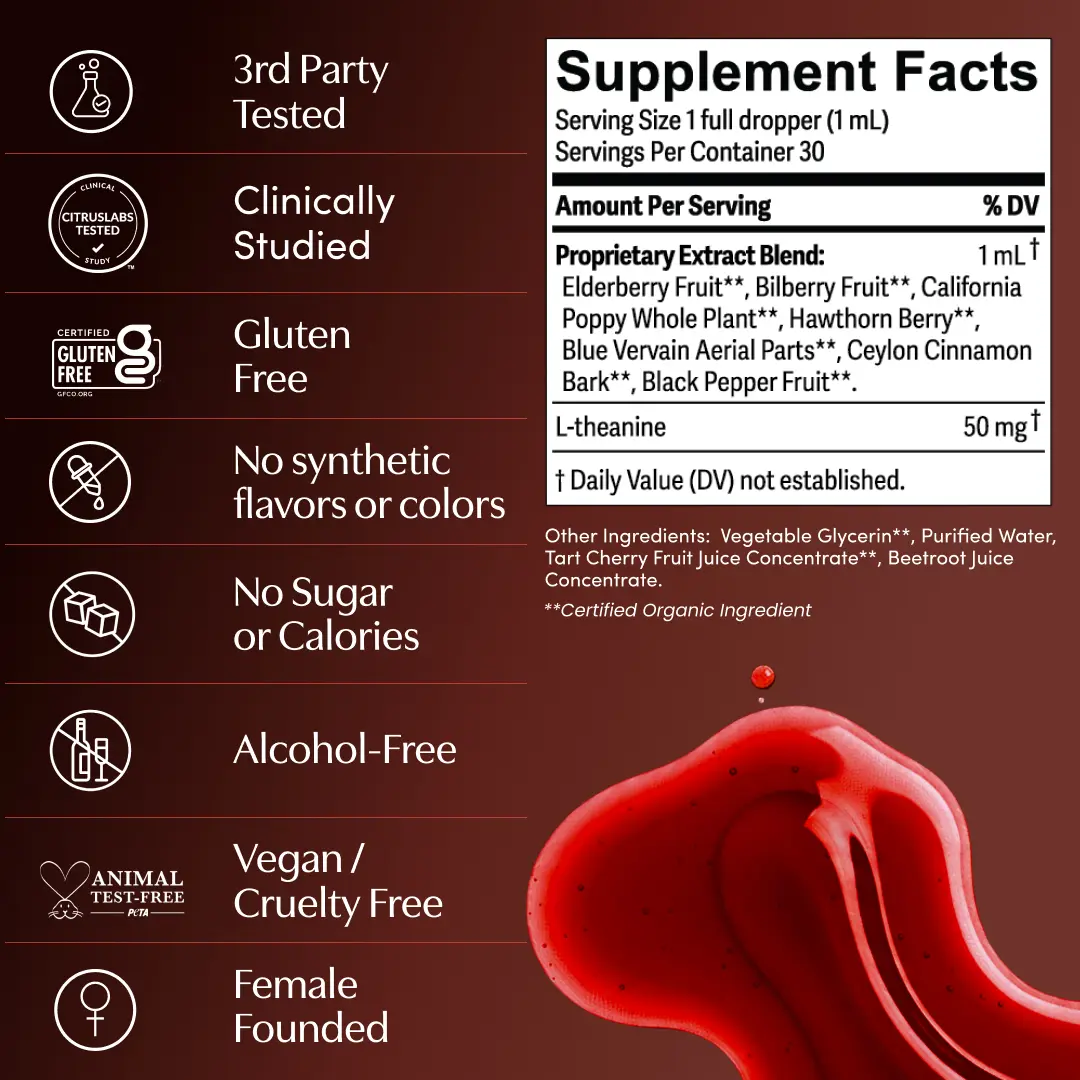 ·Elderberry Fruit**, Bilberry Fruit**, California Poppy Whole Plant**, Hawthorne Berry**, Blue Vervain Aerial Parts**, Ceylon Cinnamon Bark**, Black Pepper Fruit**, Ltheanine, Vegetable Glycerin**, Purified Water, Tart Cherry Fruit Juice Concentrate**, Beetroot Juice Concentrate. **Certified Organic Ingredient