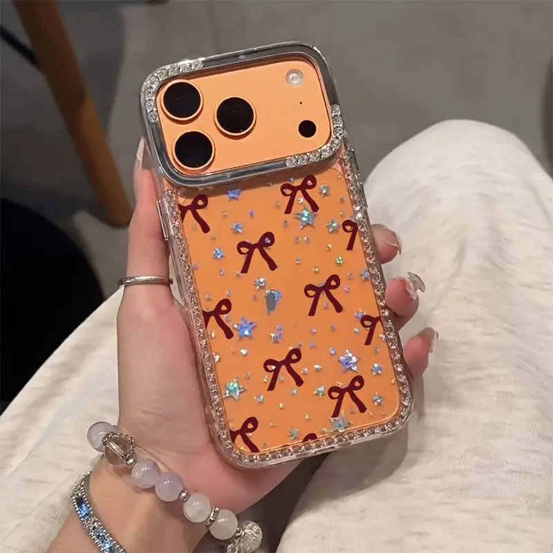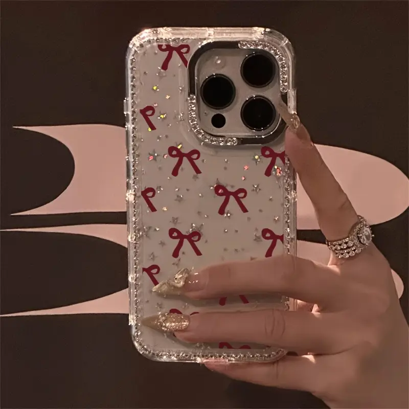 Wine-red bow pattern, transparent rhinestone frame with star design, shockproof, sparkling protective case, compatible with iPhone 17, 16, 15, 14, 13, 12 and other models. Makes a great gift for friends or family.