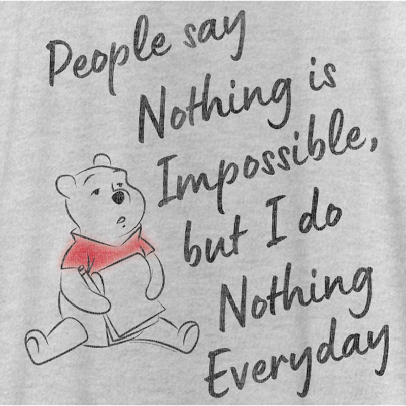 Take a stroll with Christopher Robin through the Hundred Acre Woods and join all your favorite classic characters in this officially licensed Disney Winnie the Pooh I Do Nothing Everyday Women's Graphic Racerback Tank Top! It's time for something sweet and this adorable design features Winnie the Pooh with the phrase: "People say nothing is impossible, but I do nothing every day," across the front. You'll love this new Disney apparel almost as much as Winnie the Pooh loves his honey!