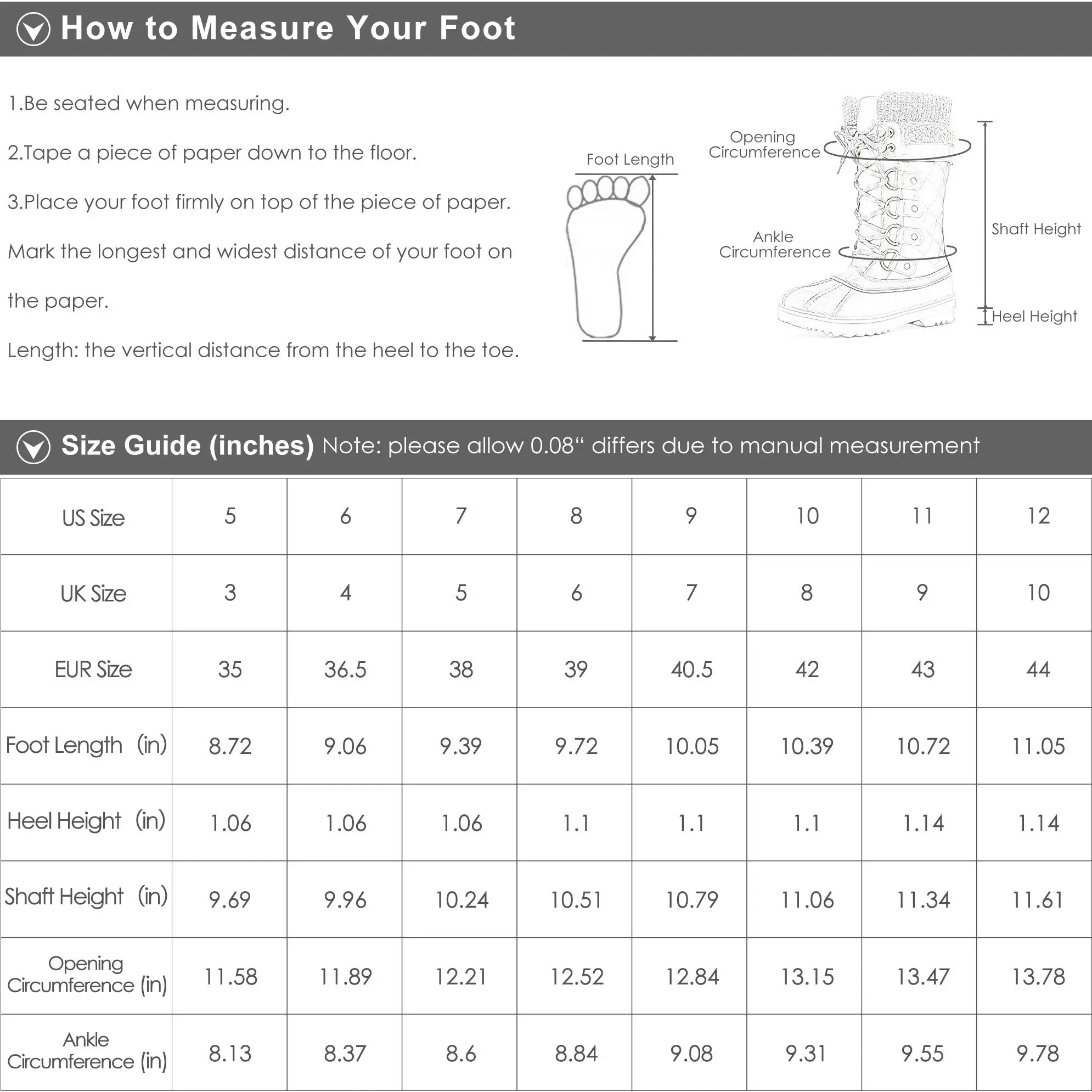 Measurements: The heel of these snow boots is 1.5-inches and the shaft is 7.5-inches with a circumference of 11-inches. For ladies who prefer a looser fit it’s advised to order up one size.