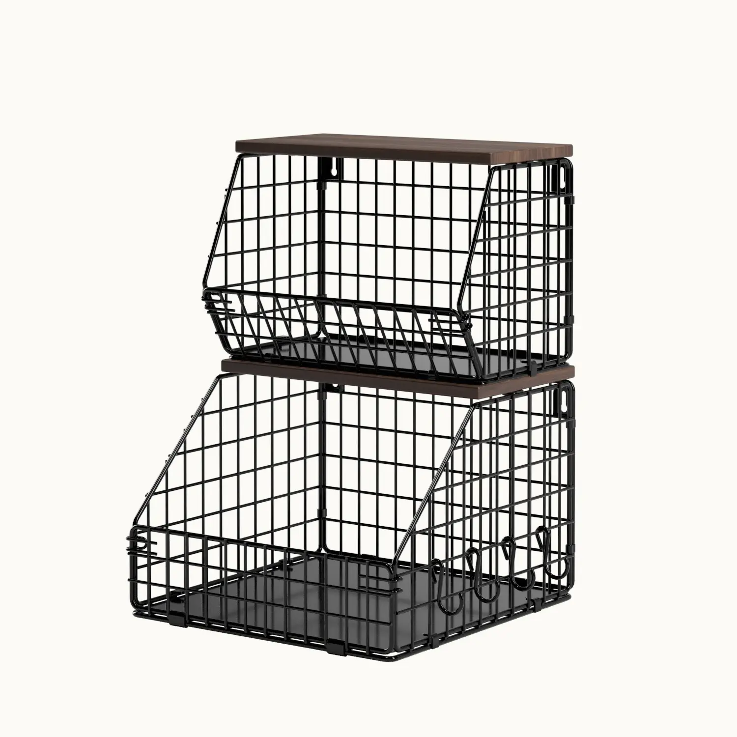 [Stackable & Wall Mounted Organizer] These versatile black wire baskets can be stacked vertically on your countertop to save space, or wall-mounted for added storage options. The multi-functional foot design at the bottom increases stability and reduces wobbling, making them ideal for any setting.