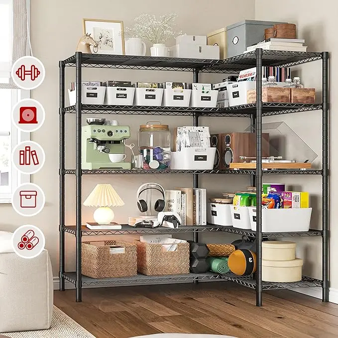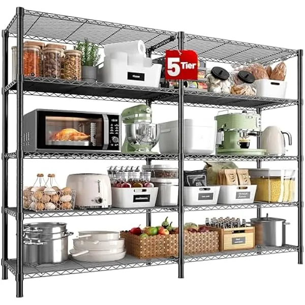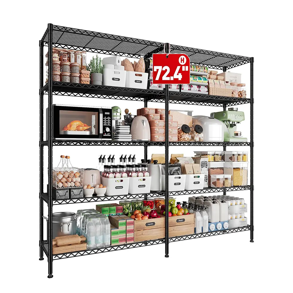 ·【1400 LBS capacity super sturdy wire shelving rack】This Metal shelves for storage made of heavy duty steel wire,and has undergone special coating treatment.Every solid thickened shelving with extra stiffener,can easily bear 280LBS a total of 1400 lbs bearing capacity .which means this metal shelving unit will always be your reliable partner.
