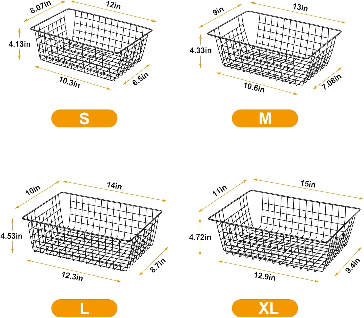 ·【DIFFERENT SIZES】You will get 4 different sizes storage baskets. The sizes of each basket is about XL: 15'' x 11'' x 4.72'';L: 14'' x 10'' x 4.53'';M:13'' x 9'' x 4.33'';S:12'' x 8.07'' x 4.13''.