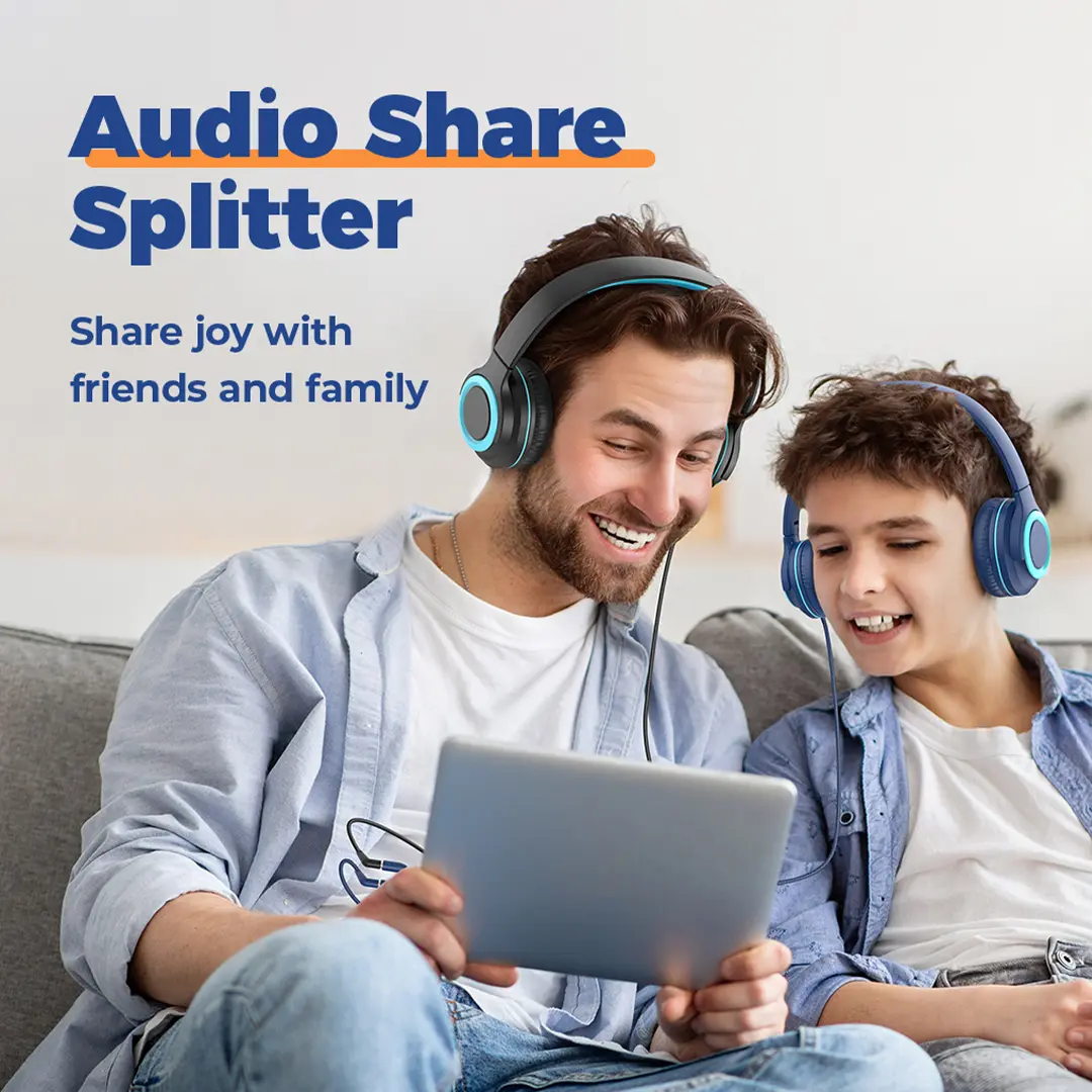 ·【Share Fun Together】: After connecting 2 over-ear headphones to a same audio player through the provided audio splitter, the kid finds a way to share happiness with family or friends.