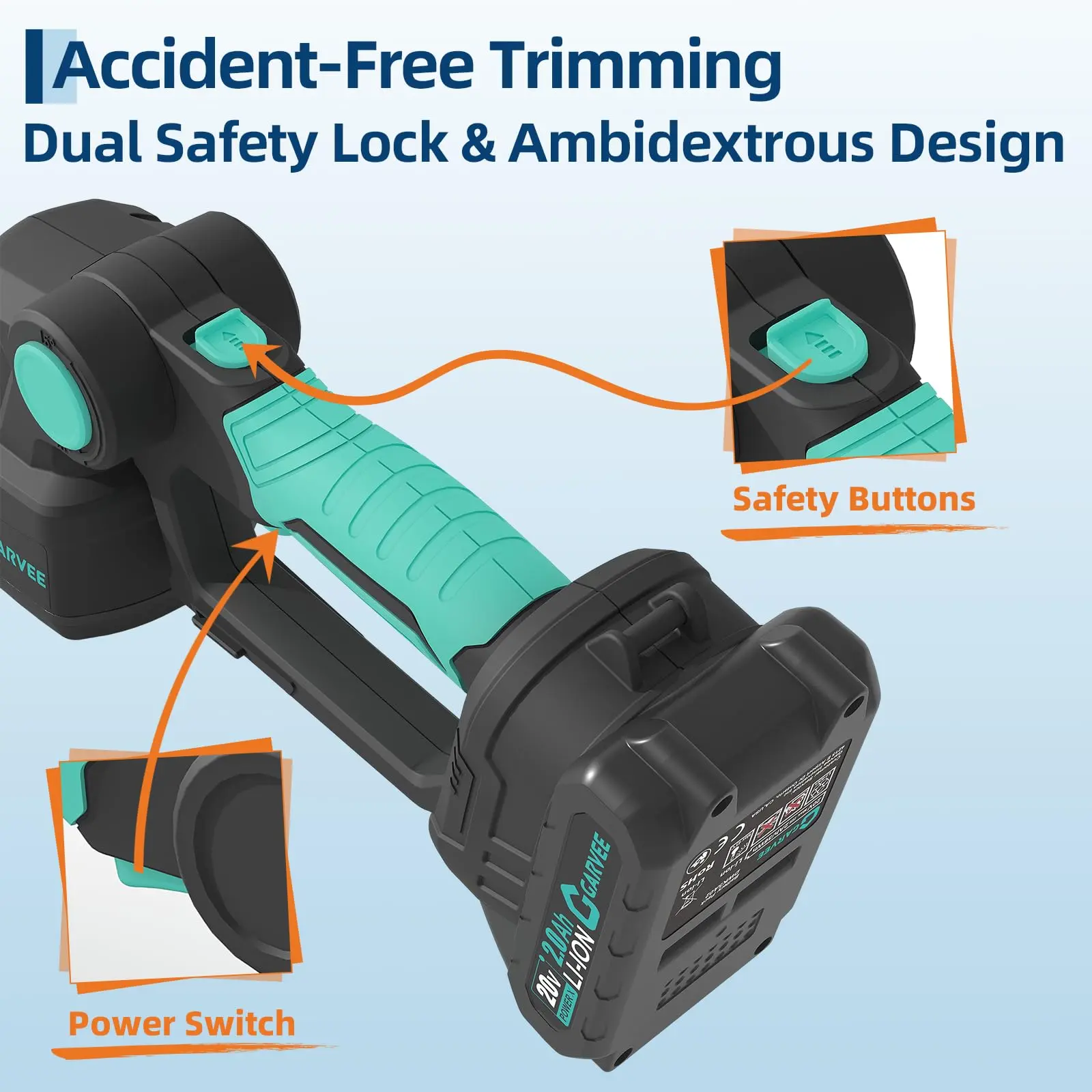 ·Enhanced Safety: Designed with blade guards, a dual-stage safety switch, and a top-positioned trigger lock, this trimmer prevents accidental starts for worry-free operation. Both the safety lock and trigger must be pressed together to activate.