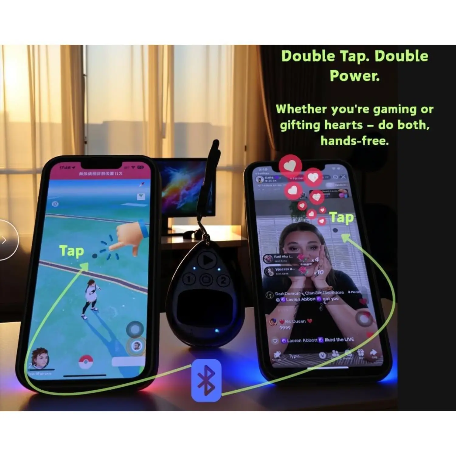 ·Pair this remote button pusher with two phones to double your fun. Use a scrolling ring for iPhone on one, run an AR pet or step-counting game on the other. Perfect for multitaskers and overnight streams.