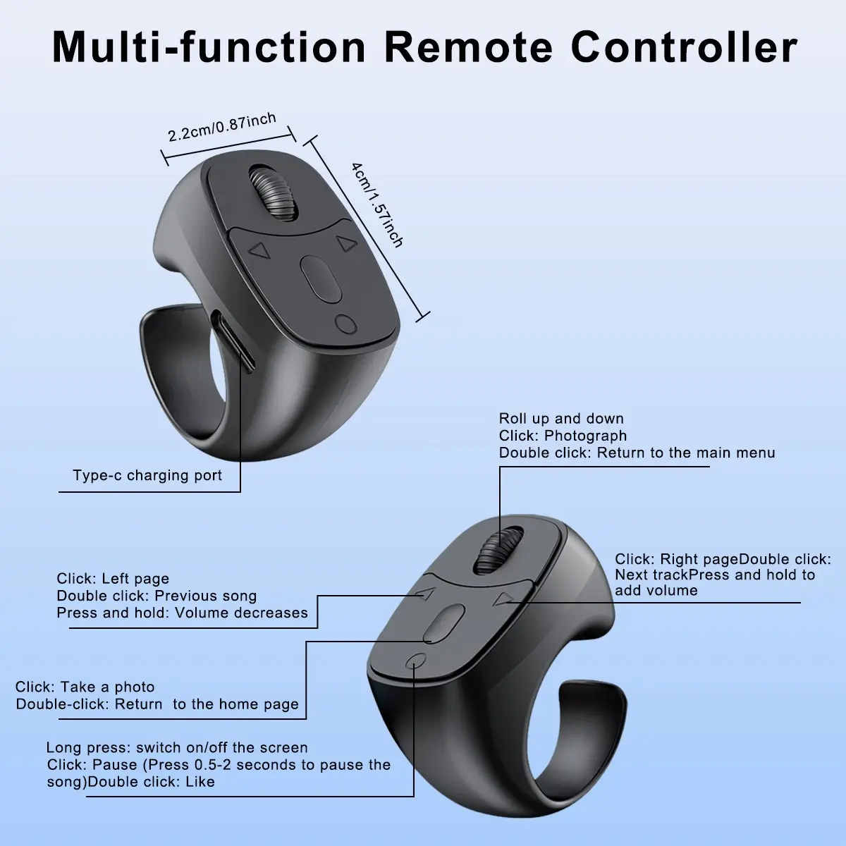 ·【Fingertip Bluetooth Remote Control】 Effortlessly swipe through short videos, turn eBook pages, take selfies, or browse comics with this fingertip Bluetooth controller—your perfect companion for convenient, hands-free operation