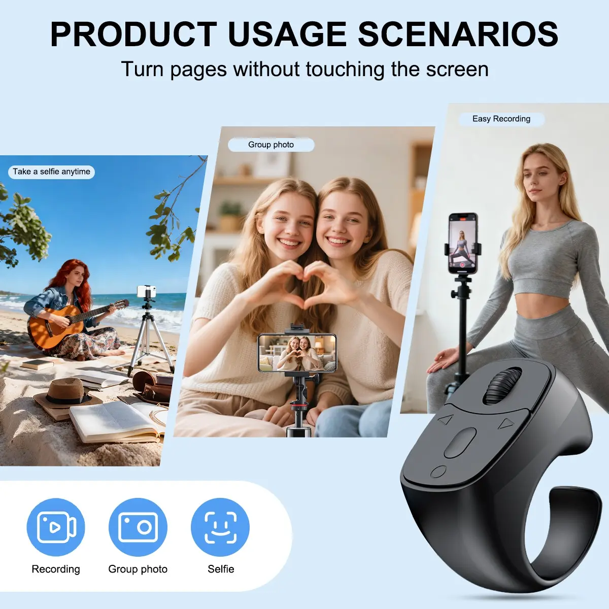 ·【Wide Device Compatibility】 Perfect for smartphones, tablets, and cameras, this Bluetooth ring remote suits both personal entertainment and professional use—great for creators, presenters, and multitaskers alike