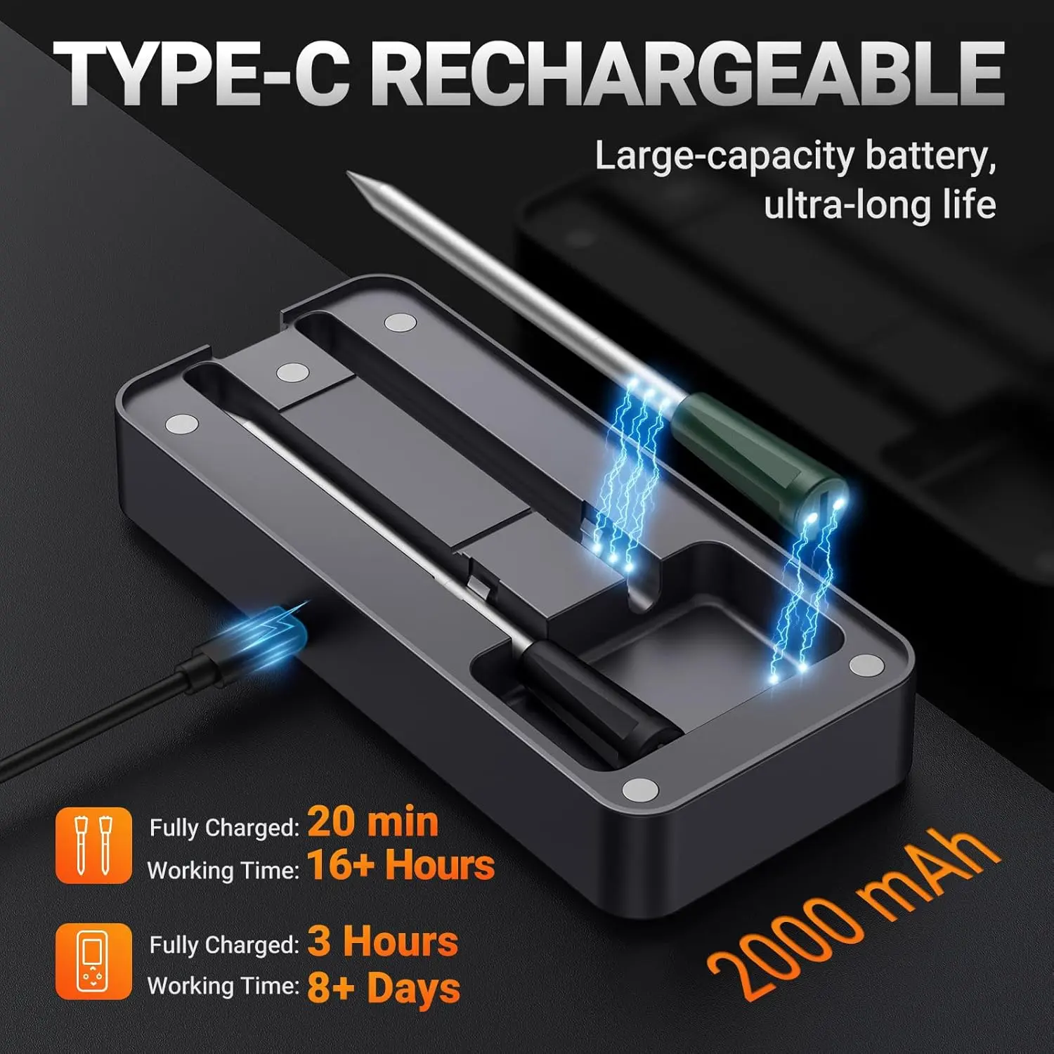 ·Type-C Rechargeable, Long Endurance Life: Built-in 2000mAh Lithium battery, the smart base can work more than 8 days if on a full charge, and 16 hours for probe of continuous working when fully charged.