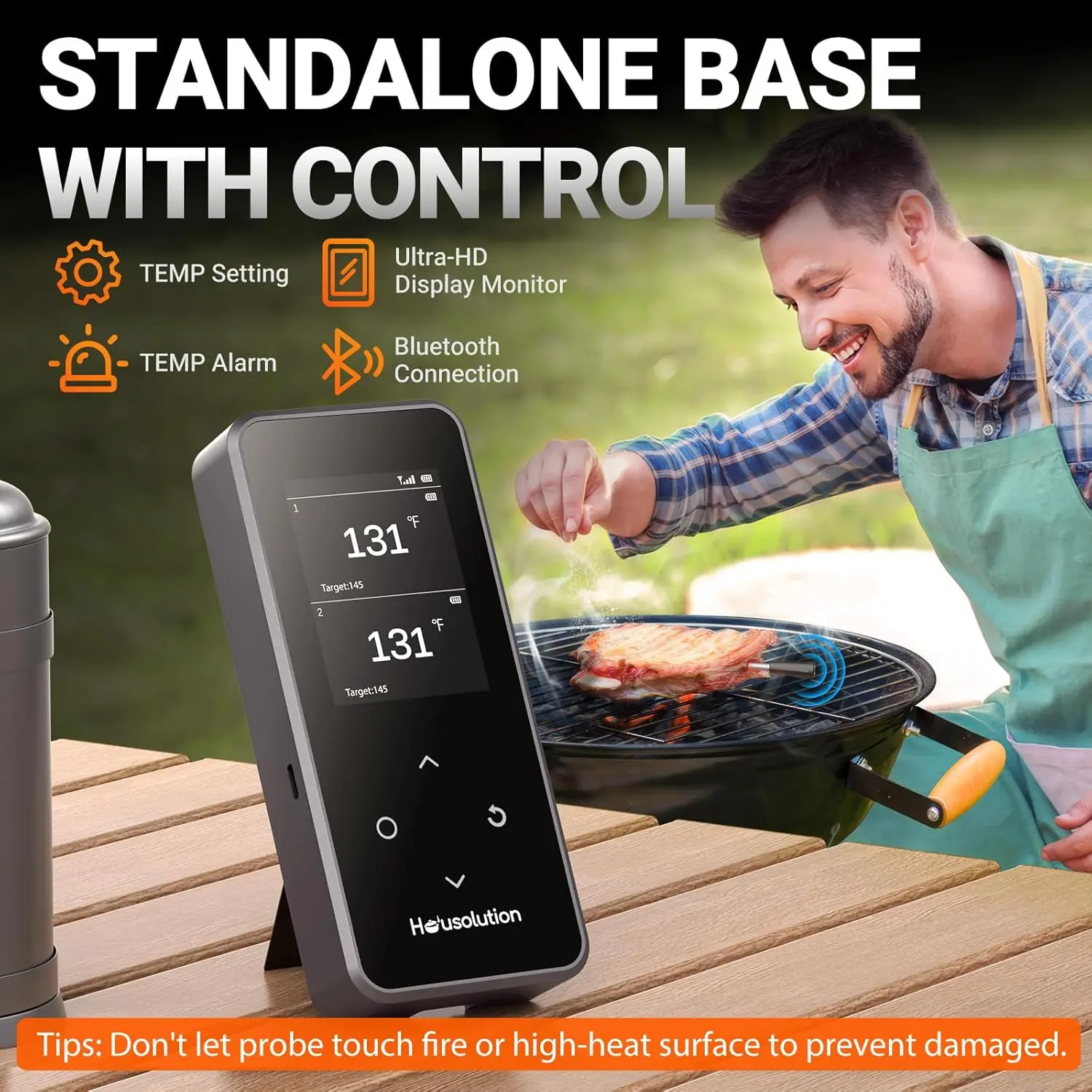 ·Smart Standalone Base with Control: The Housolution wireless meat thermometer features a versatile smart base, not only provides charging function, but also offers real-time temperature readings and allows you to set temperatures directly on the device. Besides, It also has function of alarm prompt and probe protection, magnetic suction for easy store.