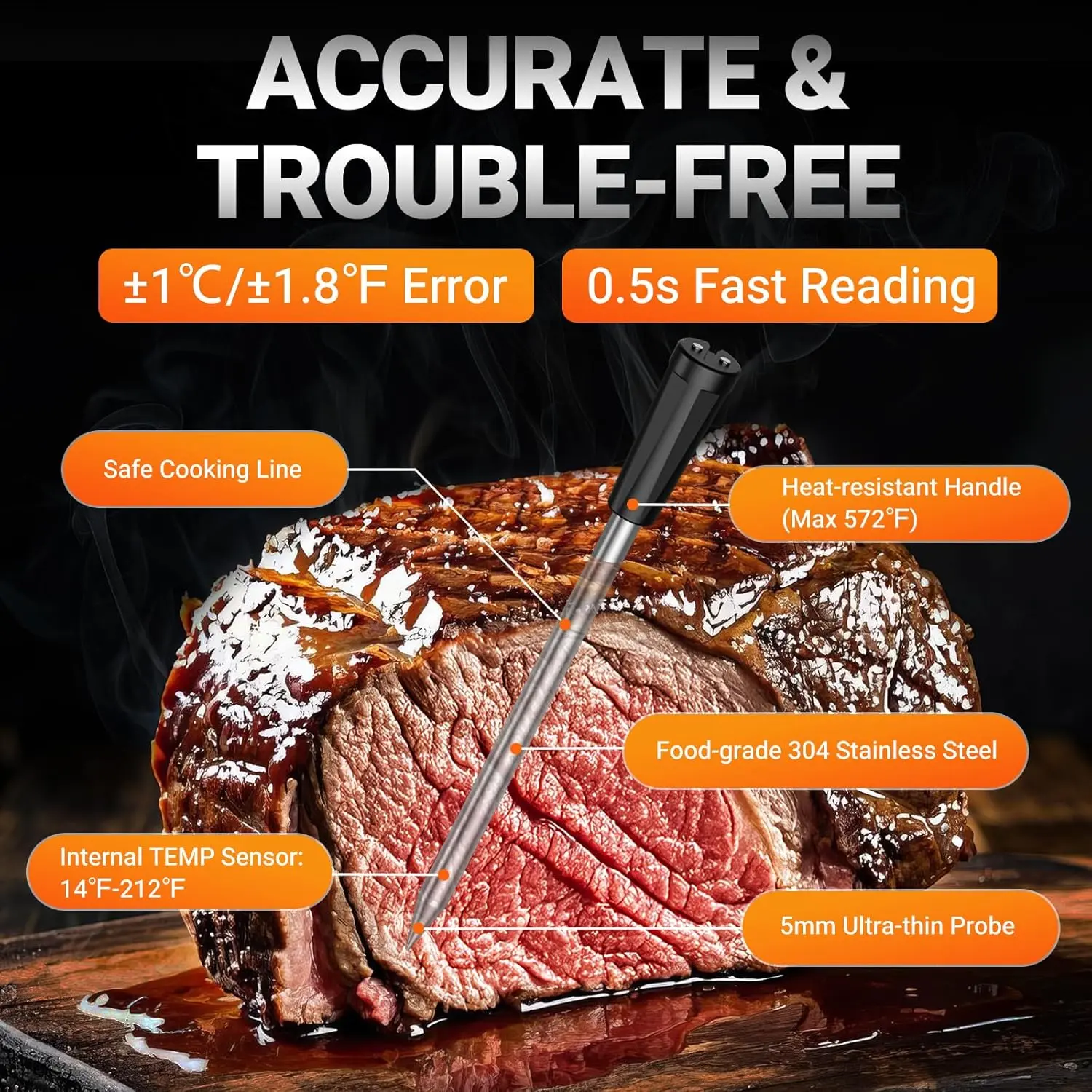 ·High-Heat Resistance & IPX7 Waterproof: Our durable probe withstands temperatures up to 572°F, making it perfect for grilling, roasting, and other cooking scenarios.
