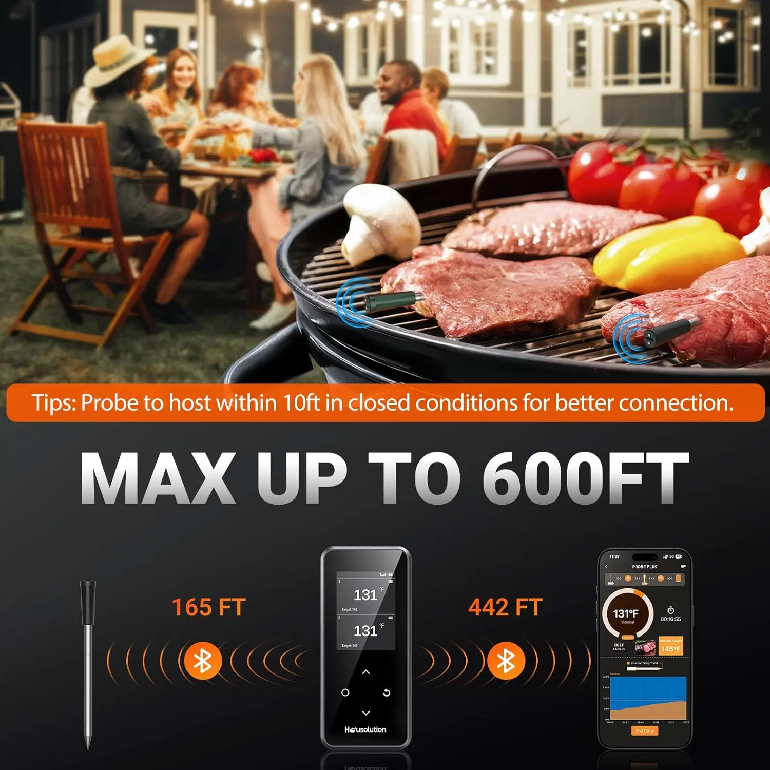·With a superior IPX7 waterproof function, the Housolution probes are easy clean-up with water (Tips: Ensure probe is fully inserted into the meat and cover the marking line, don't let probe touch fire or high-heat surface to prevent damaged)