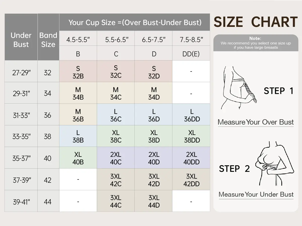 The bra fits pretty true to size, I typically wear a 36DD and the XL fits good. I am getting some middle boob spillage so I’m going to keep adjusting the straps in hopes that I find the right length and it works itself out.