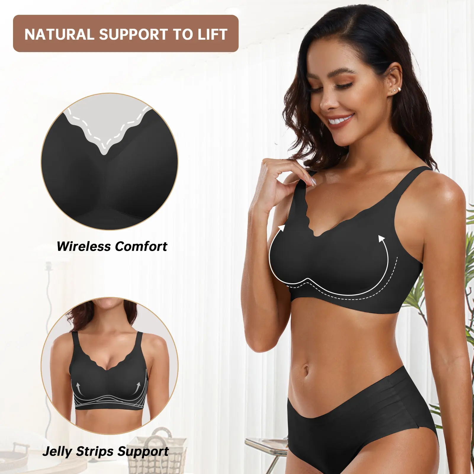 ·【"W" Jelly Strip, No Wire Bra】Women's bralettes adopts "W" shaped "Jelly Strip" support that provides 360° support and comfort for your breasts, with no wires, thin and no binding, naturally lifting and shaping a good chest shape. The hem won't roll or ride up, allowing free movement. The 3D three-dimensional cup design is gentle like skin, and the cups are removable to provide you with a pleasant experience!