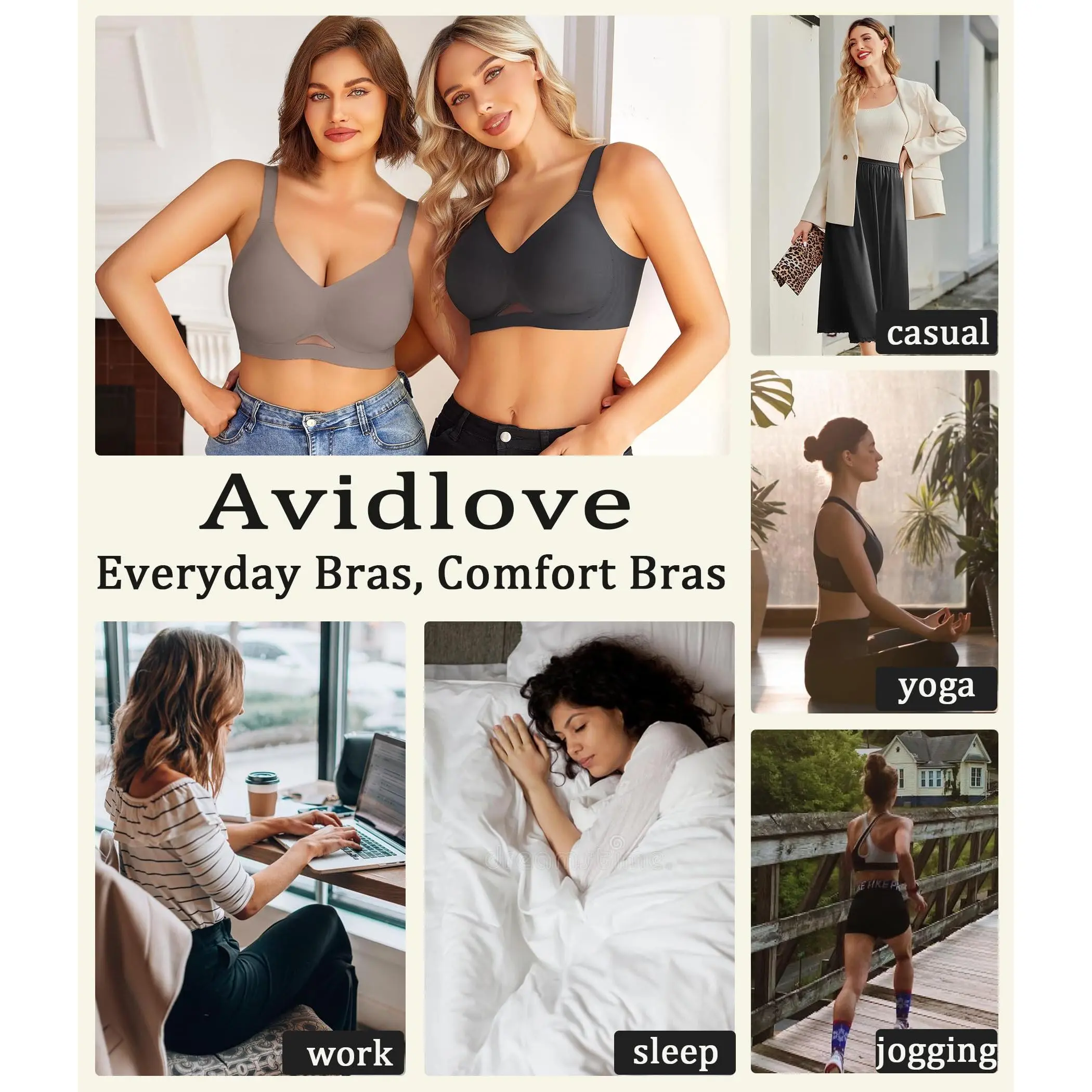 ·T-shirt Bras for Women: Wirefree bras for women, tshirt bra is smooth, soft and stretchy, no show, semi-fixed pads, freely removable, suitable for daily wear. Avidlove wireless bra can be used as an everyday bra, casual bra, body shaping bra, T-shirt bra, sleep bra, yoga bra, lightweight sports bra etc. Whether it is daily work or sports and leisure, wireless pushup bra for women can meet your needs.
