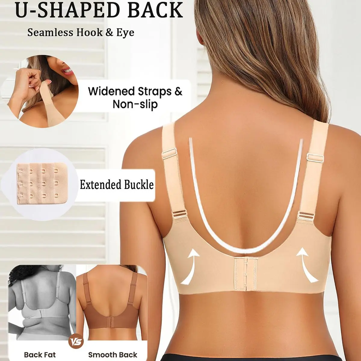 ·Regular and Plus Bras: Women bras no underwire is suitable for women of all ages and can accommodate different breast shapes and sizes from small to extra-large. This bra is perfect suitable for big breasts. It has 5 rows of back clasps and extension clasps to accommodate all body shapes. S (32B, 32C, 34A, 34B); M (34C, 34D, 36A, 36B); L (34DD, 36C, 36D, 38A, 38B); XL (36DD, 38C, 38D, 40A, 40B); 2XL (38DD, 40C, 40D, 42A, 42B); 3XL (40DD, 42C, 42D, 44A, 44B)