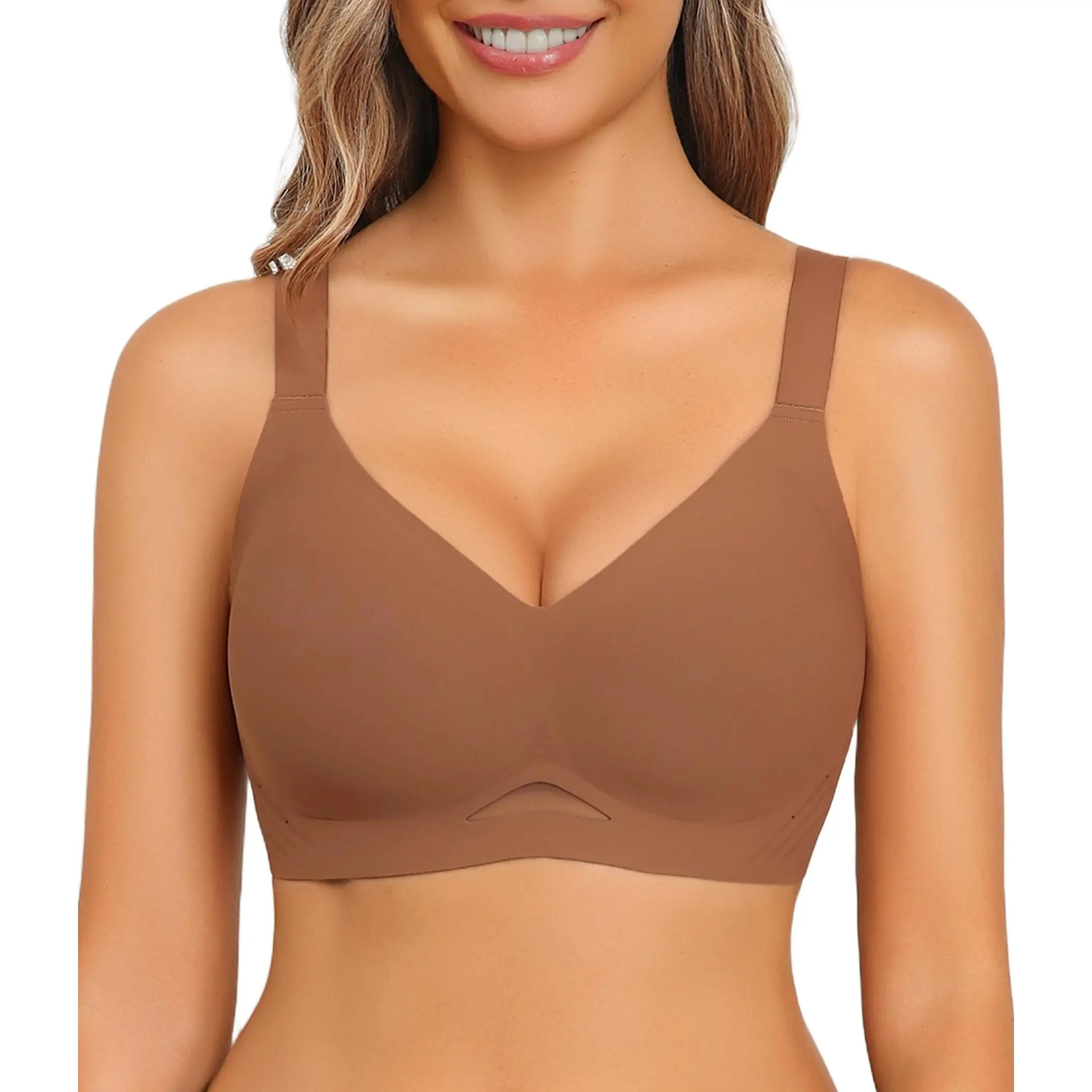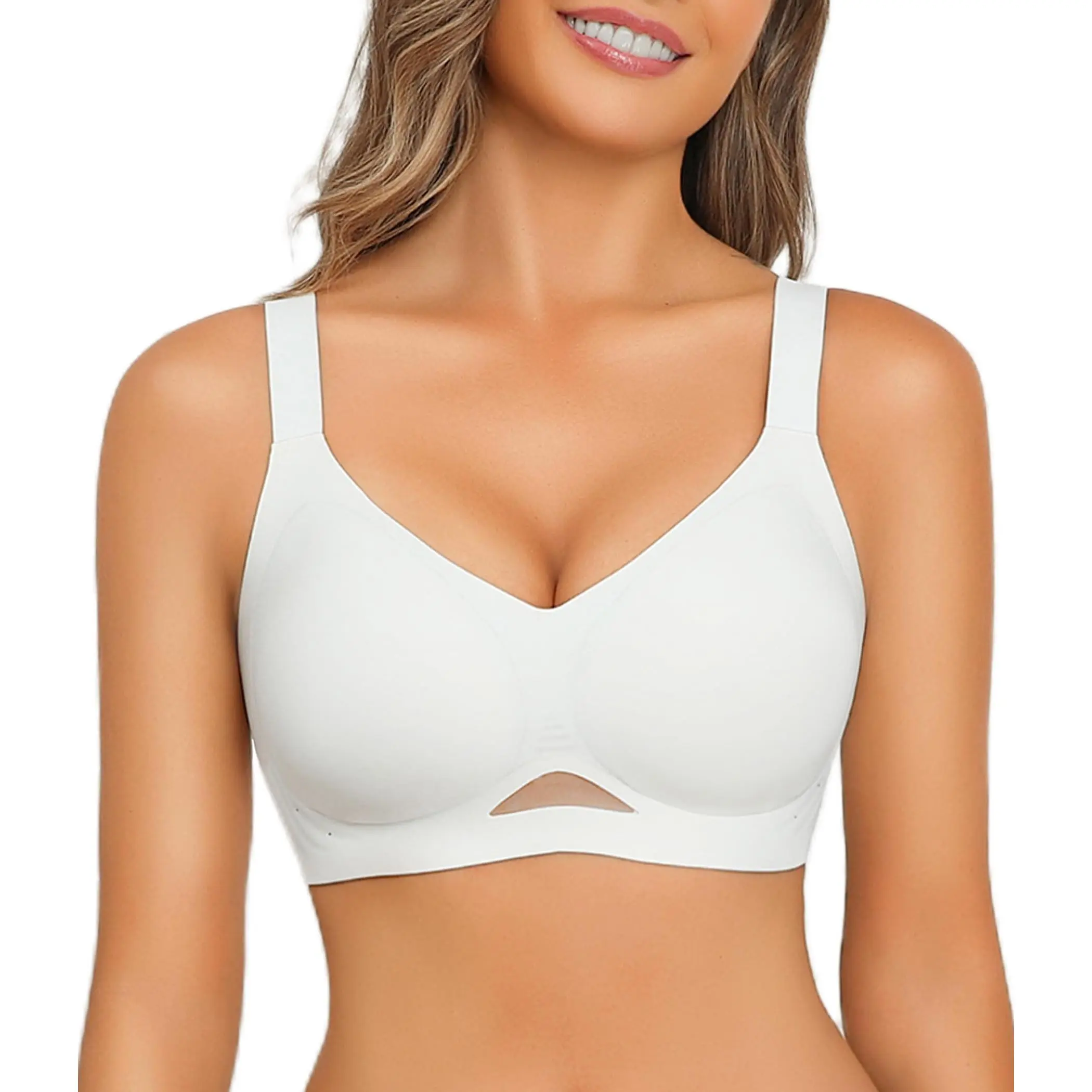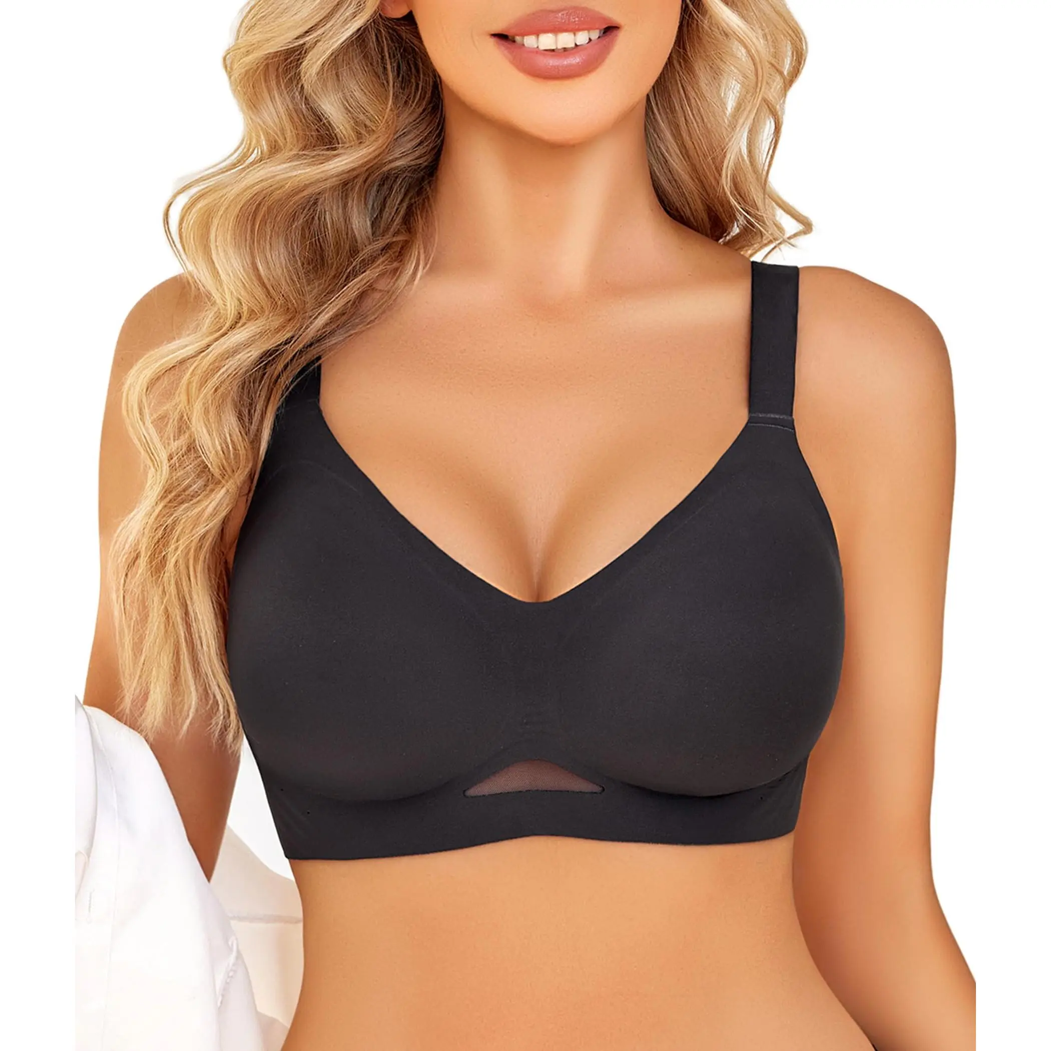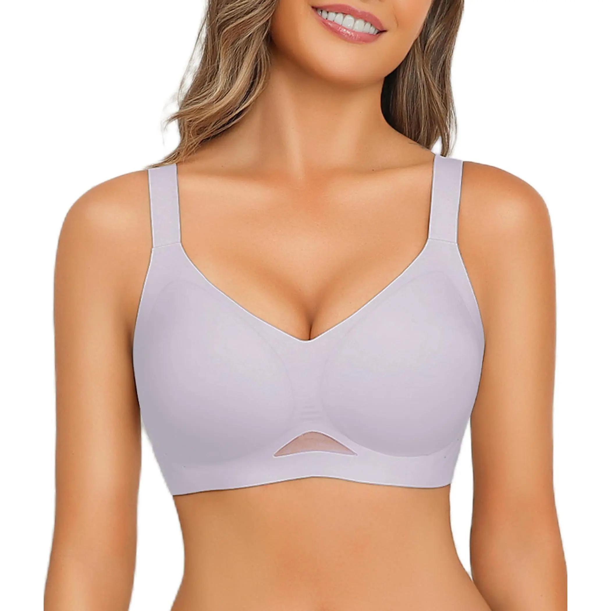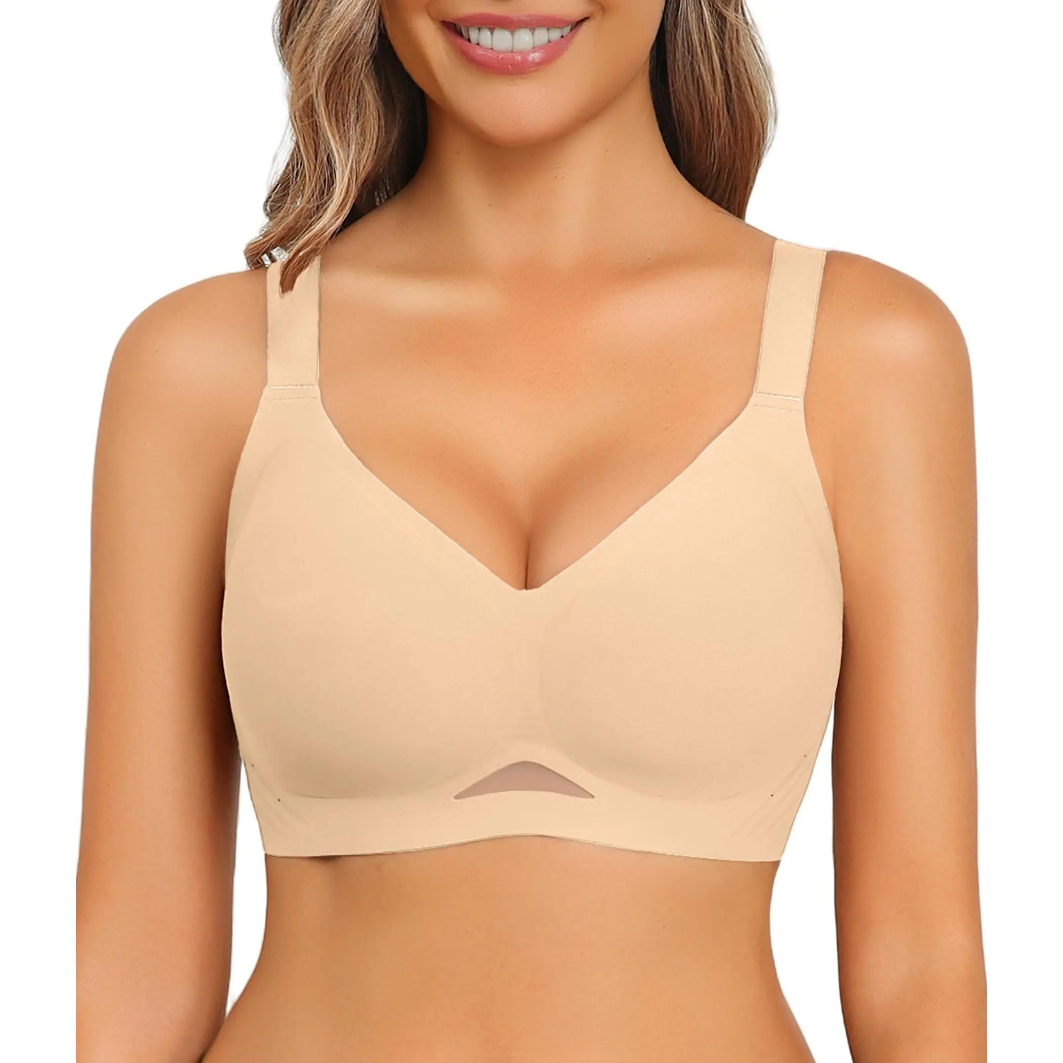 ·Seamless Bra with Mesh: Womens bras no underwire, fashionable and elegant in design, both practical and ornamental. V-neck highlights the bust curves; side small hole and the mesh design is sexy and breathable; the widened shoulder straps are non-slip and adjustable; the U-shaped back and wide side wings can hide underarm and back fat, creating a flat back.