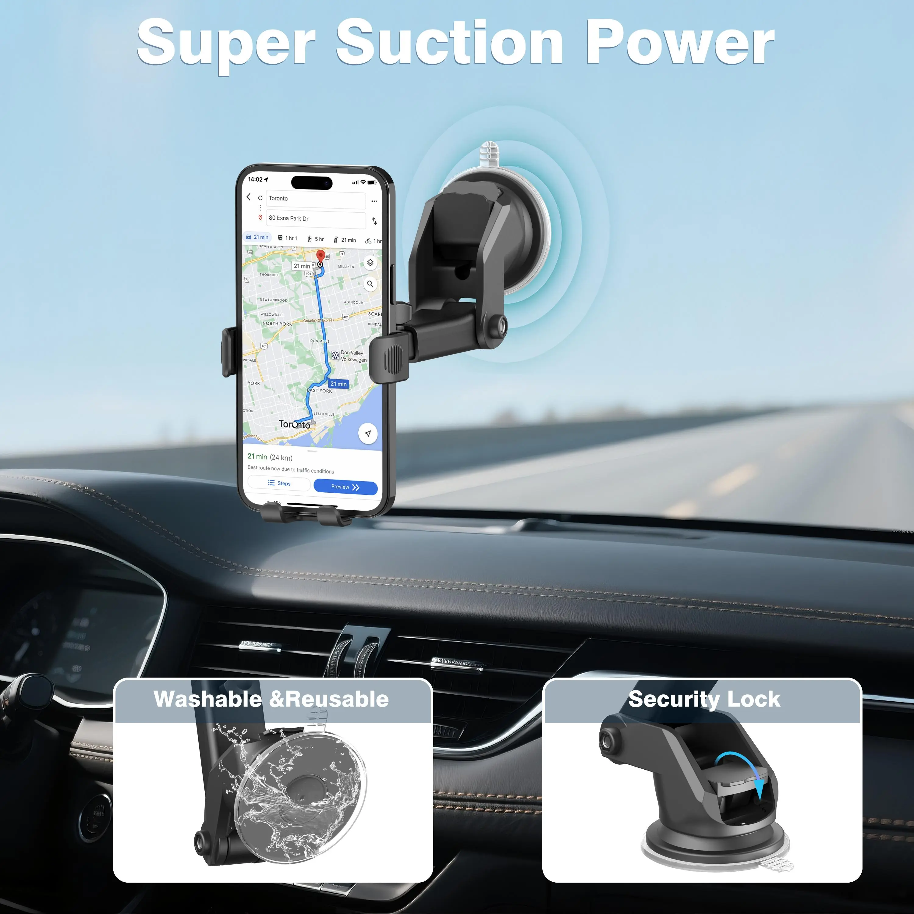 360° Adjustable Mount • Ball joint for perfect viewing angles • Single-knob tightening system • Mounts on vent, windshield, or dashboard