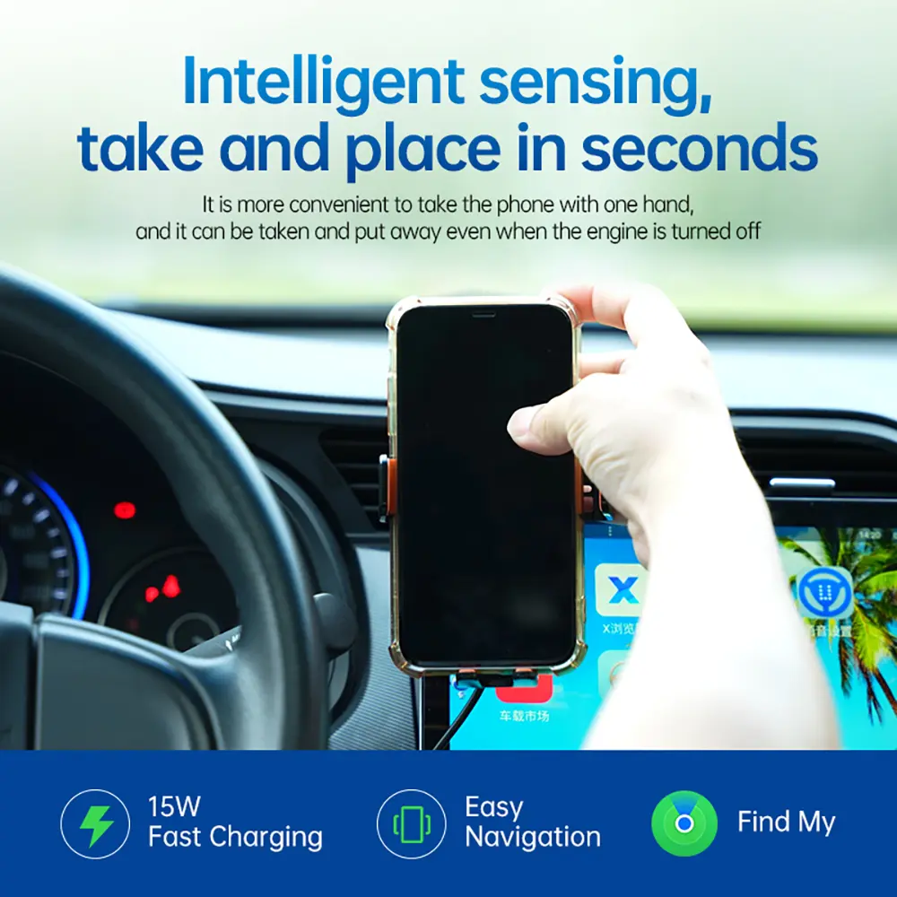 Experience effortless and safe driving with our phone car mount. It automatically clamps your phone when connected, providing convenience and enhanced safety. The charger's arms open with a simple touch on the 2 sides button. Plus, it intelligently powers off and protects your phone's battery when it's fully charged.